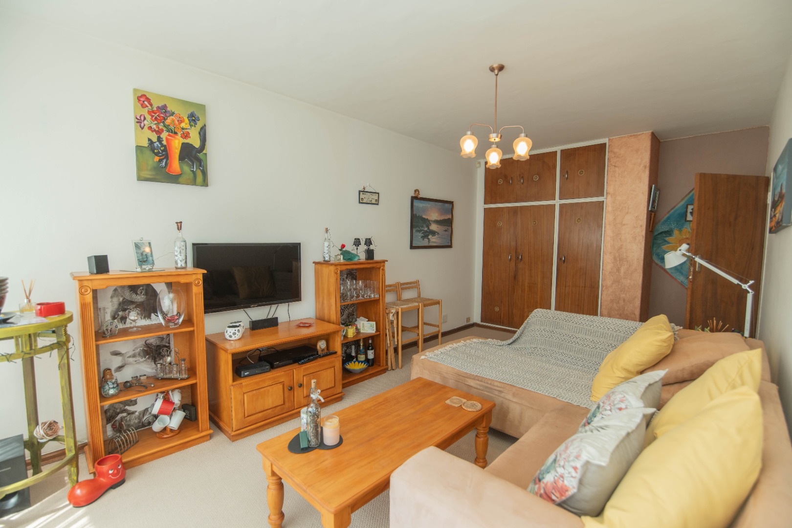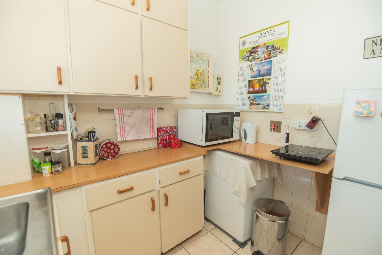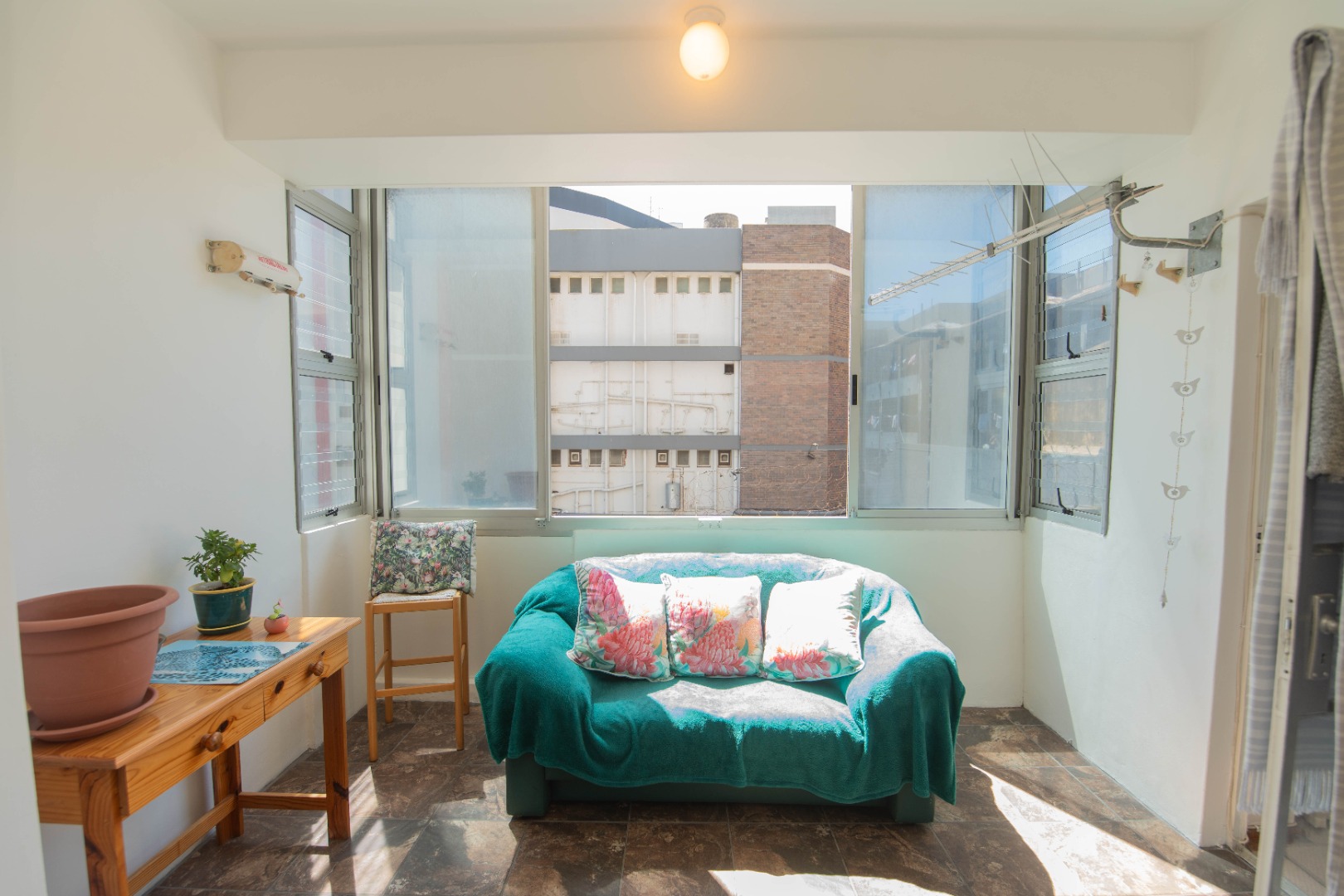 while large windows enhance the sense of openness and light. Bonus of built-in cupboards for added