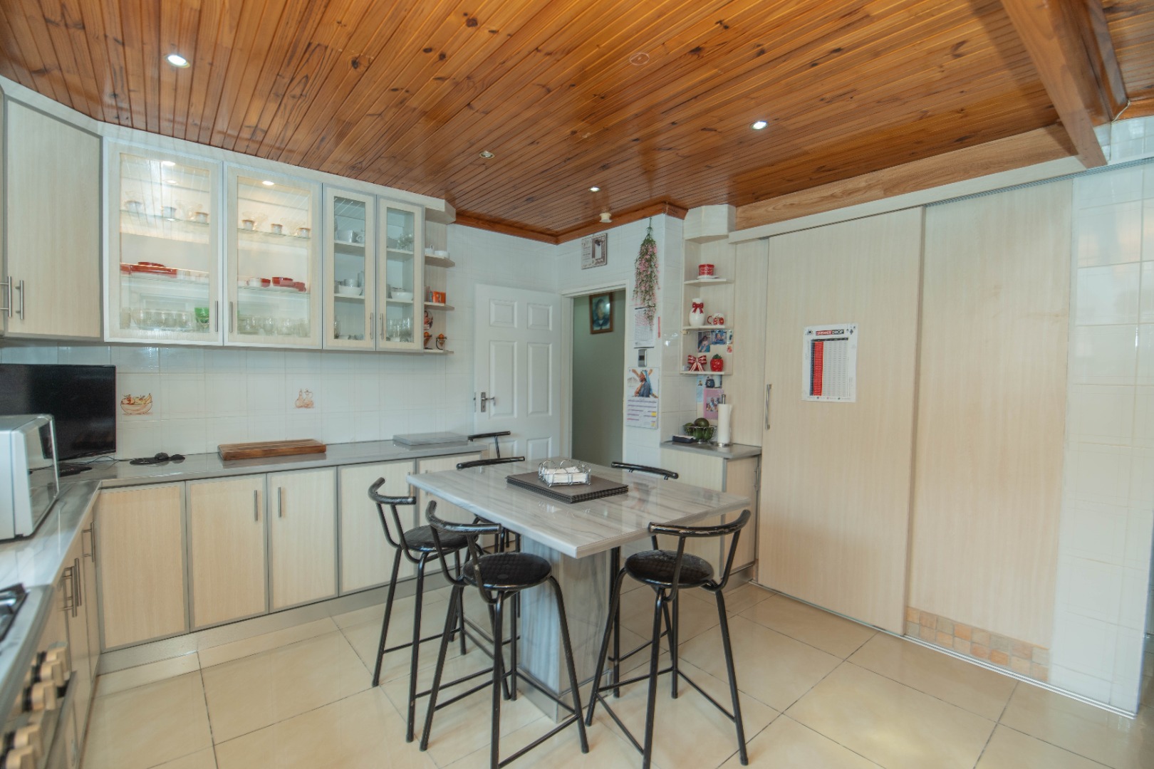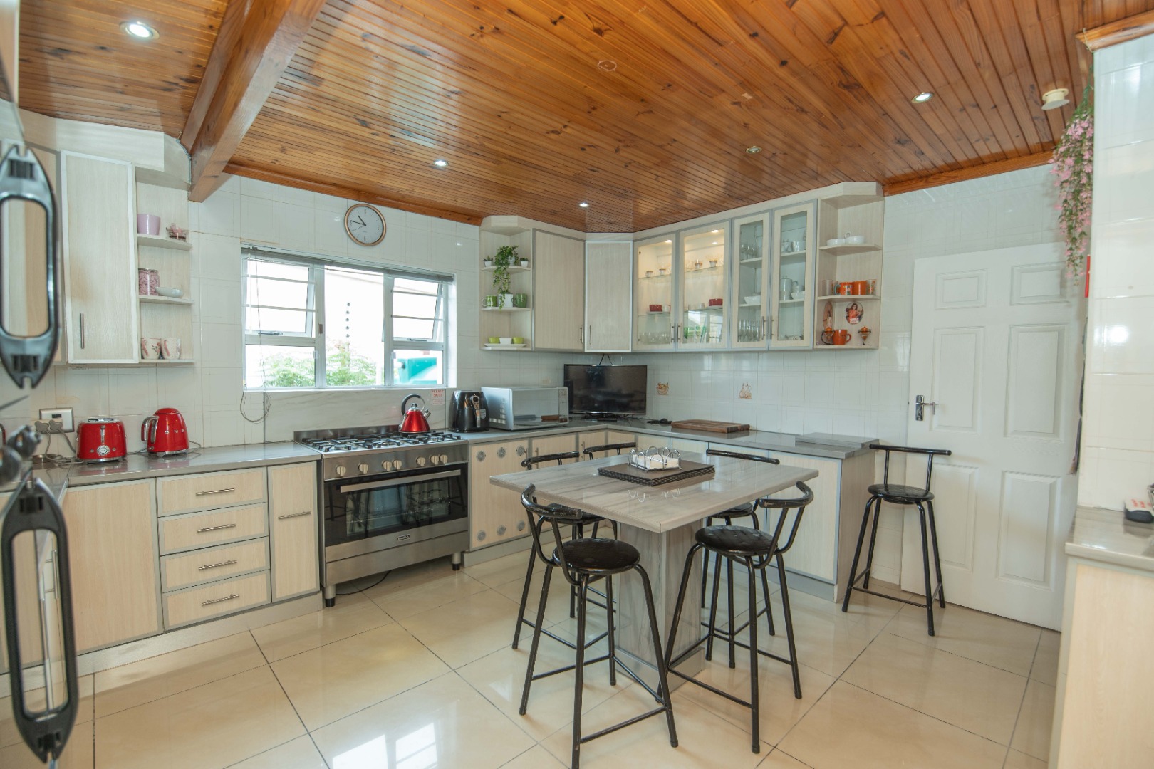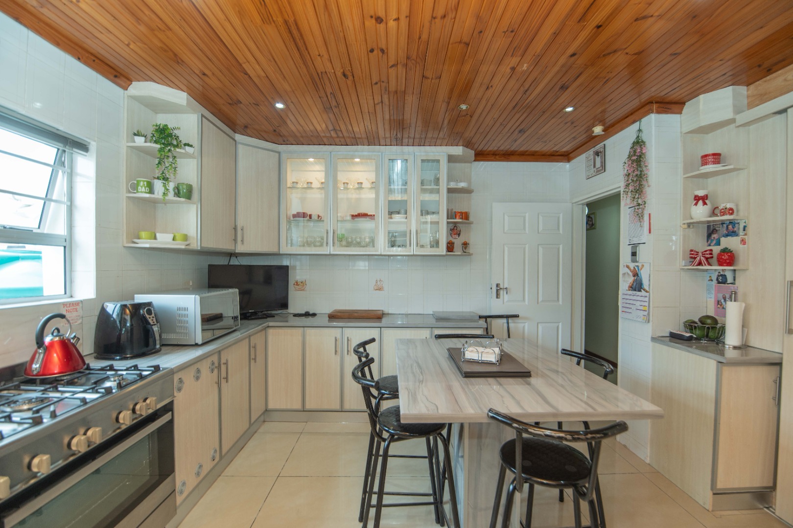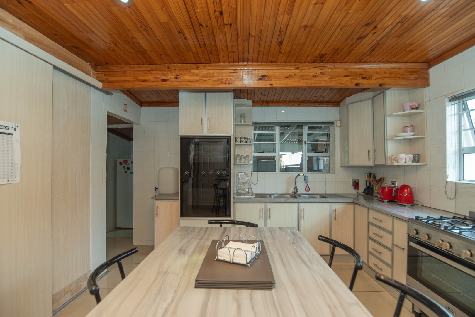 The large kitchen is a standout feature with its knotty pine ceiling, centre island, Elba gas stove and oven, and a large walk-in pantry, making it ideal for everyday cooking and entertaining.