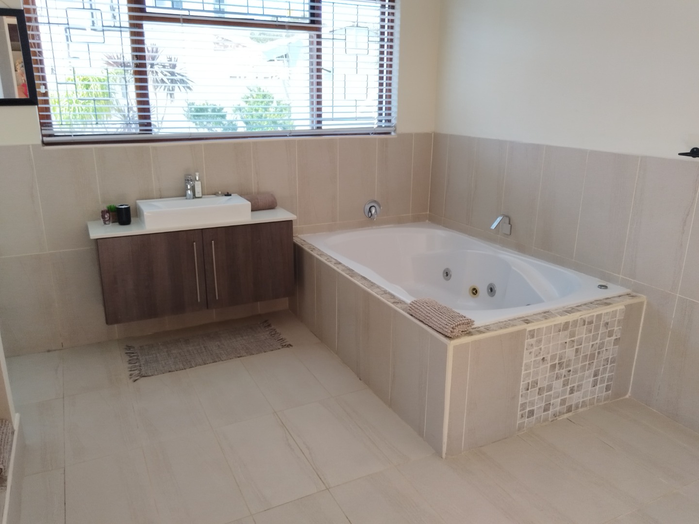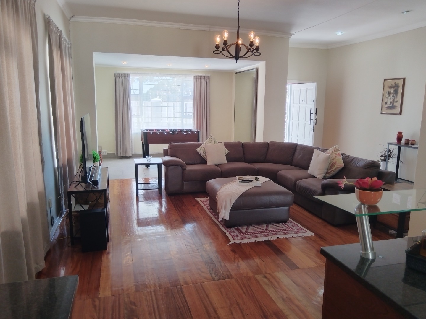 The home offers a seamless blend of comfort and luxury. The open-plan kitchen features modern finishes, a sleek island with stainless steel extractor, and blends effortlessly into the living area with polished wood floors and stylish décor. Enjoy entertaining on the covered patio, pool, and braai area, suggesting a relaxing resort style lounge area.