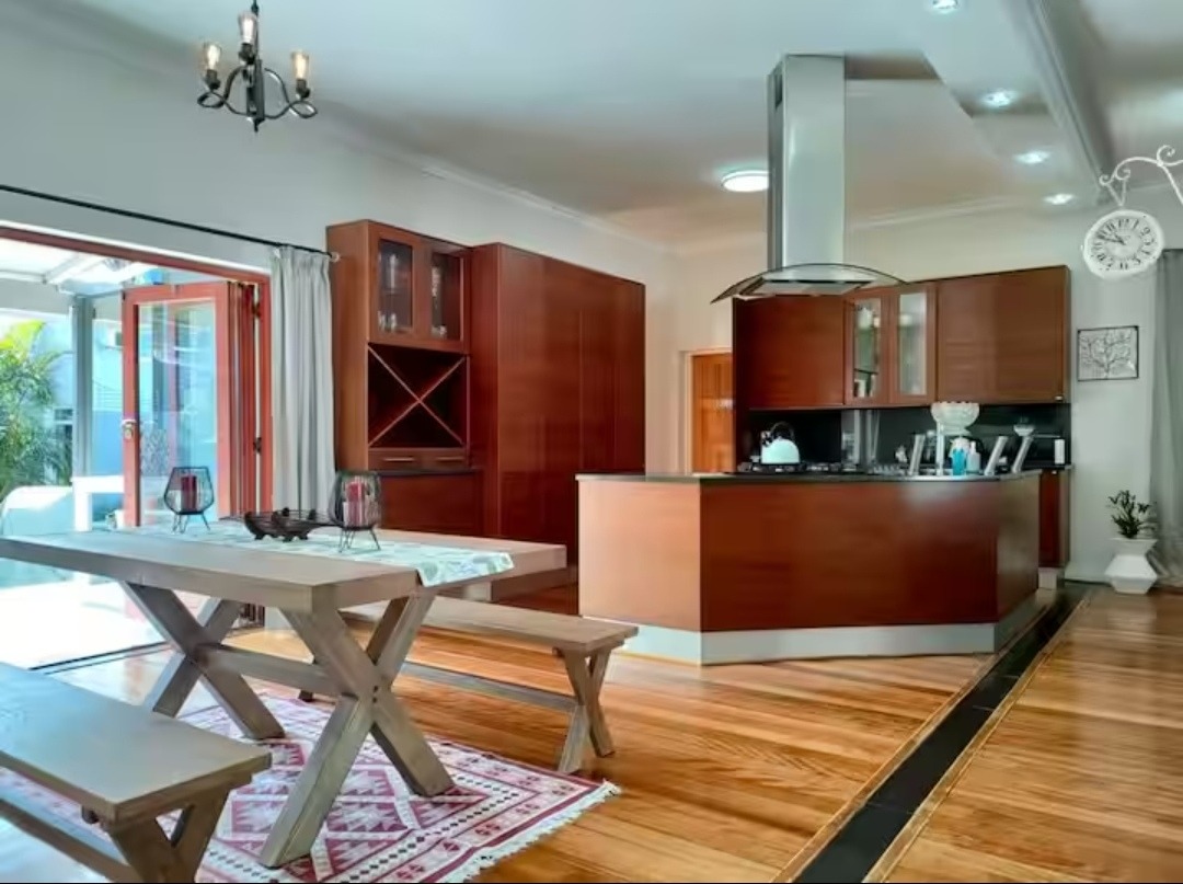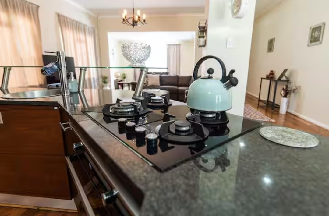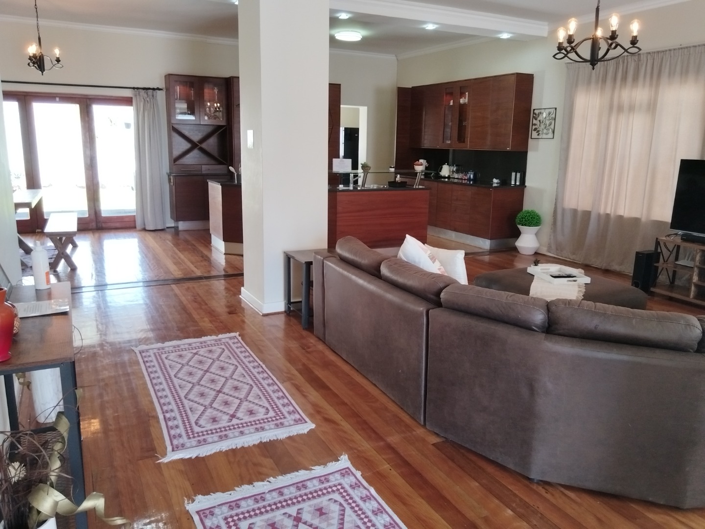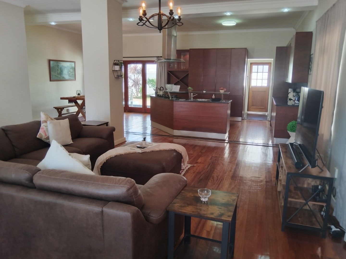 The home offers a seamless blend of comfort and luxury. The open-plan kitchen features modern finishes, a sleek island with stainless steel extractor, and blends effortlessly into the living area with polished wood floors and stylish décor. Enjoy entertaining on the covered patio, pool, and braai area, suggesting a relaxing resort style lounge area.