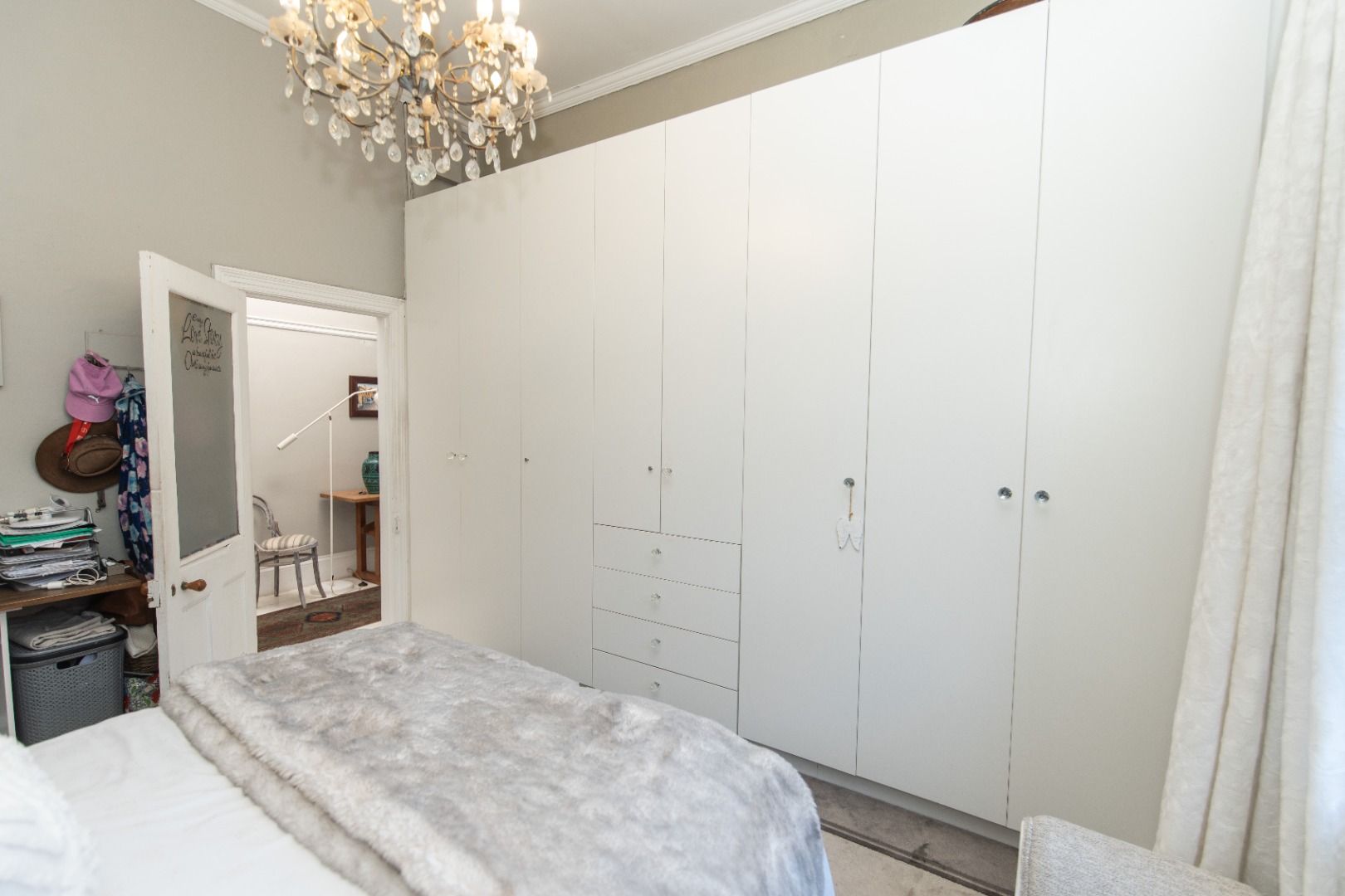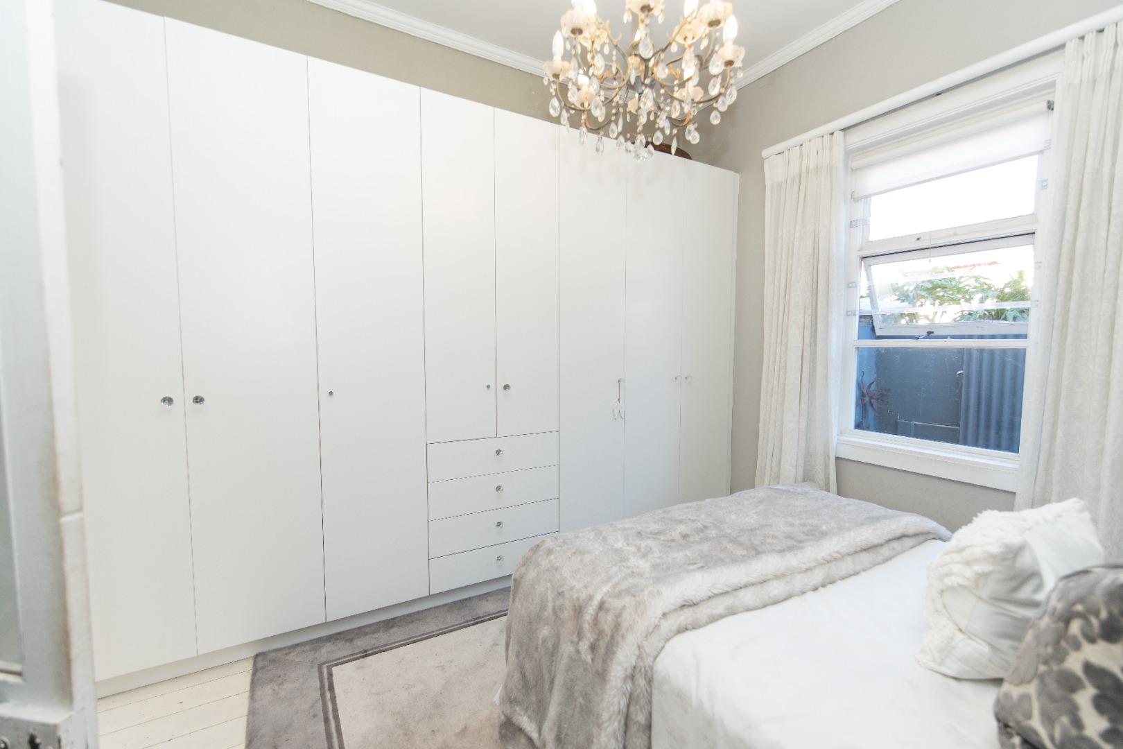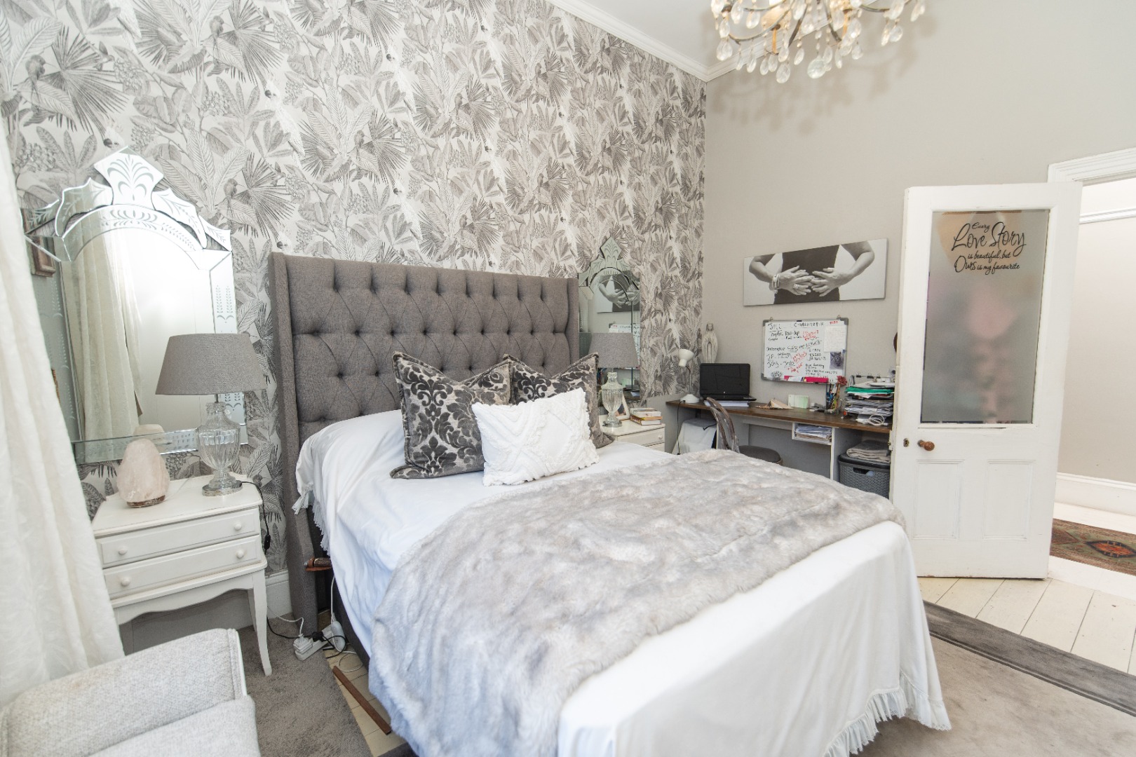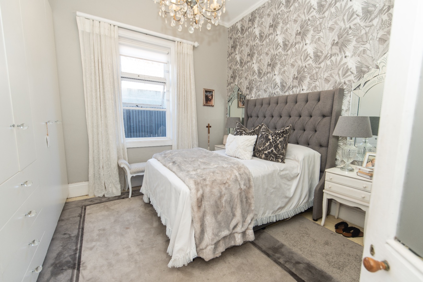 The front bedroom has a bay window and main bedroom fitted with a beautiful chandelier and plenty wall to wall built in cupboards with bling crystal handles.
