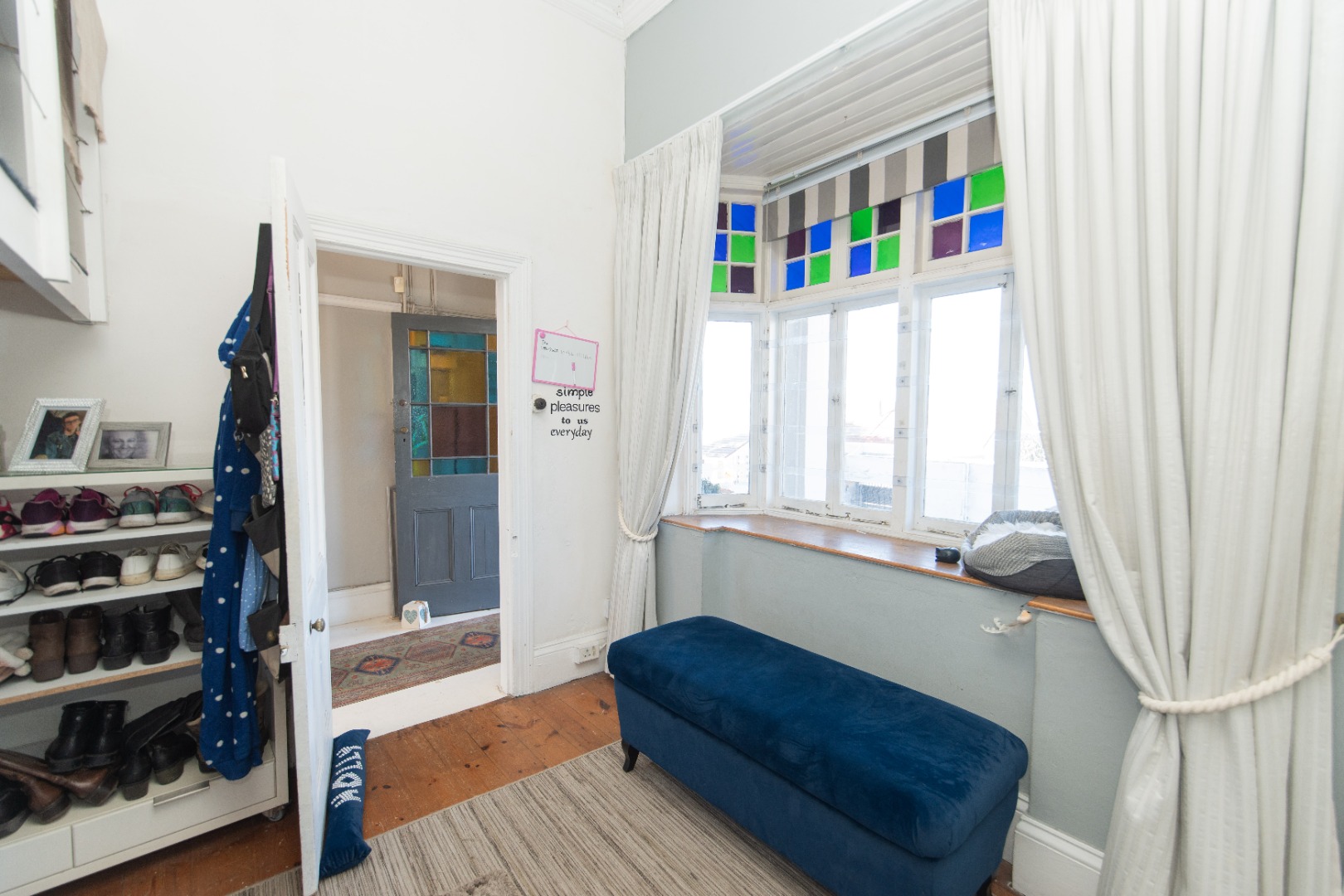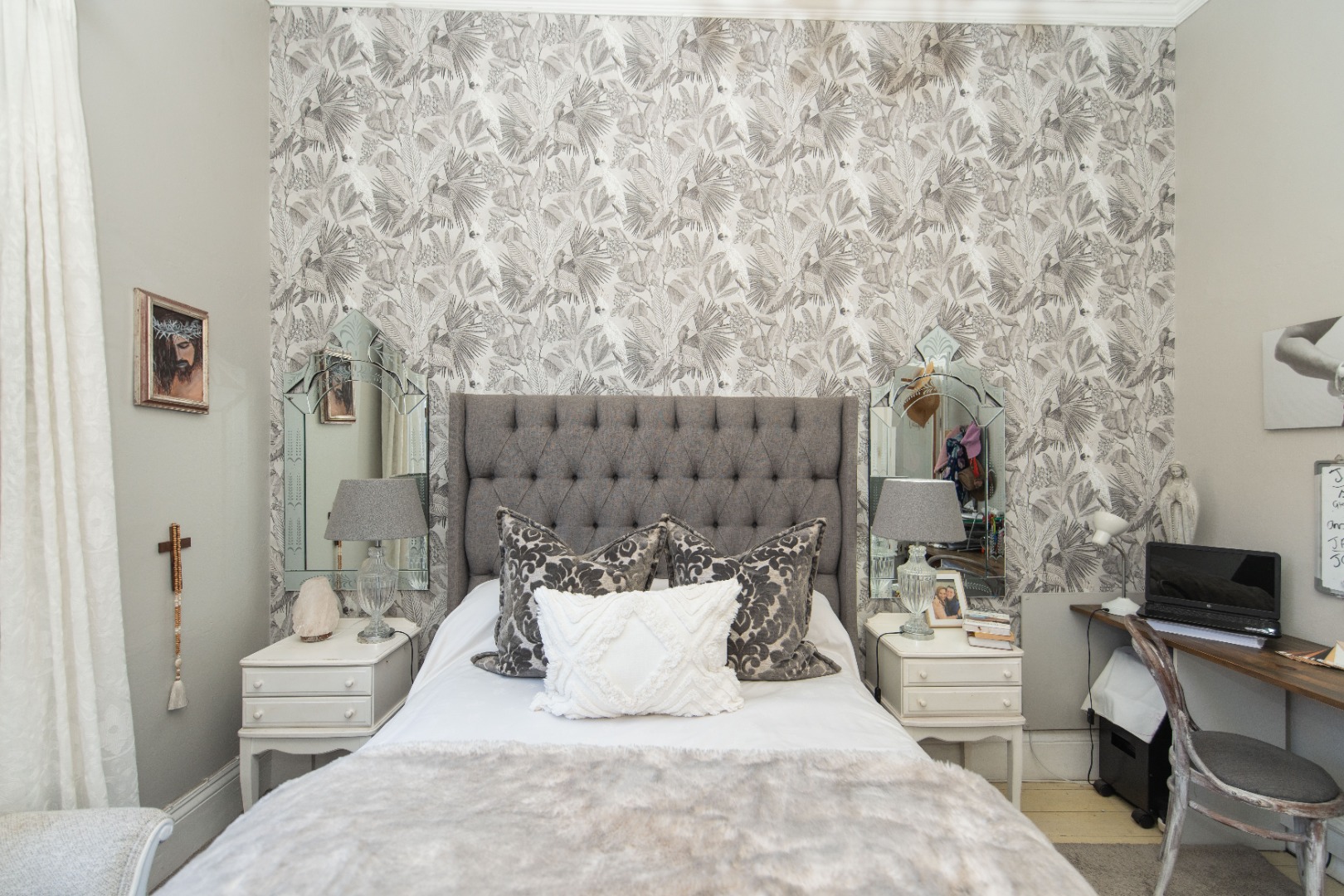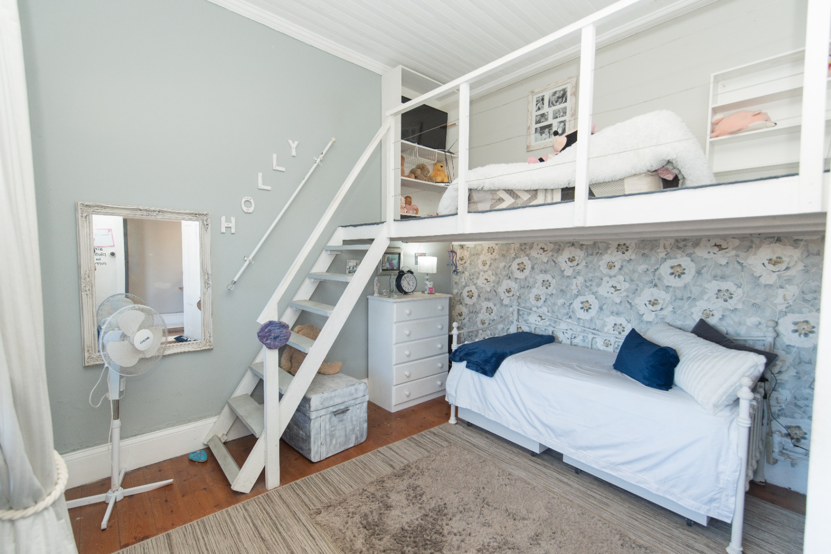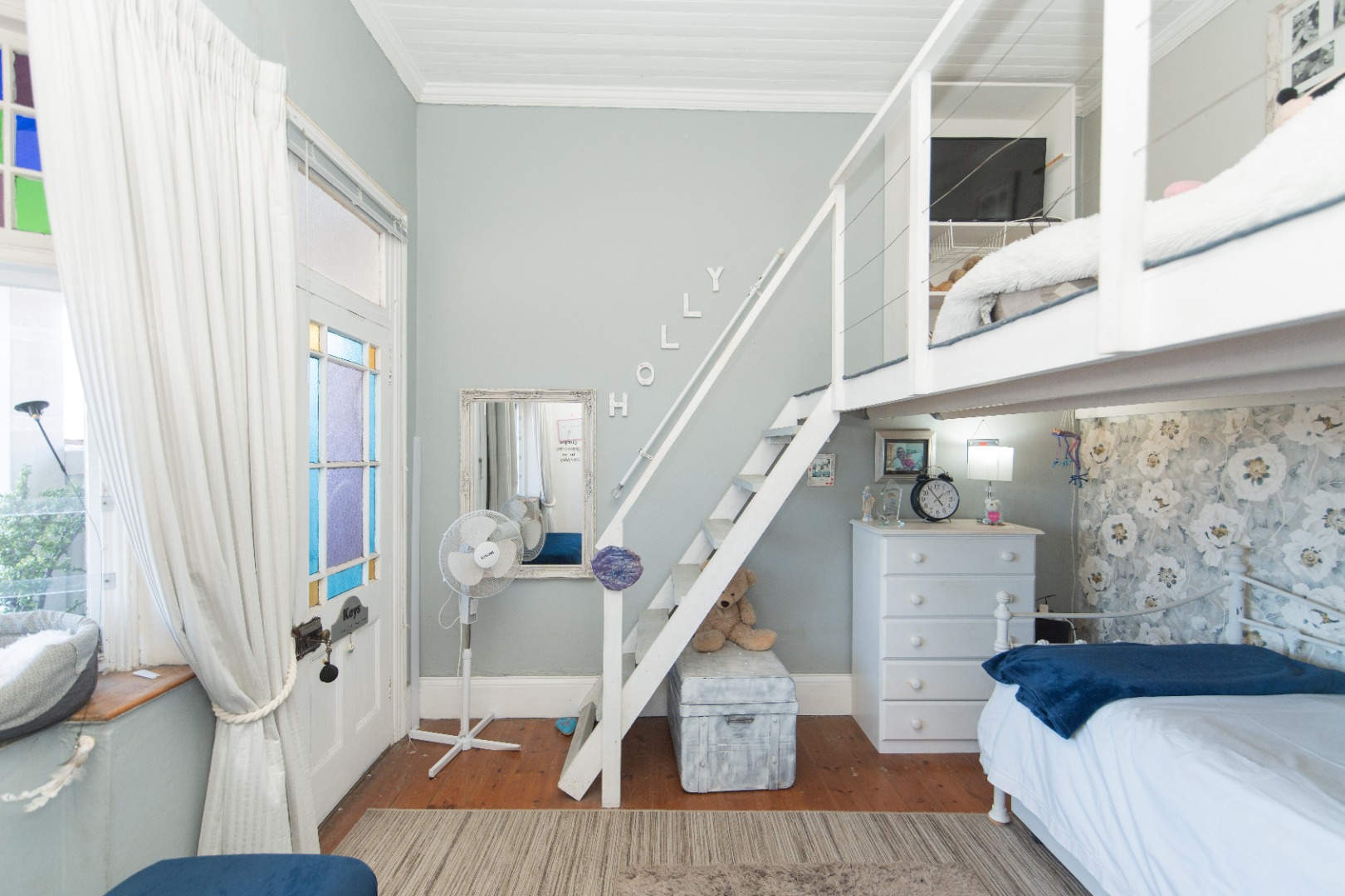 The front bedroom has a bay window and main bedroom fitted with a beautiful chandelier and plenty wall to wall built in cupboards with bling crystal handles.