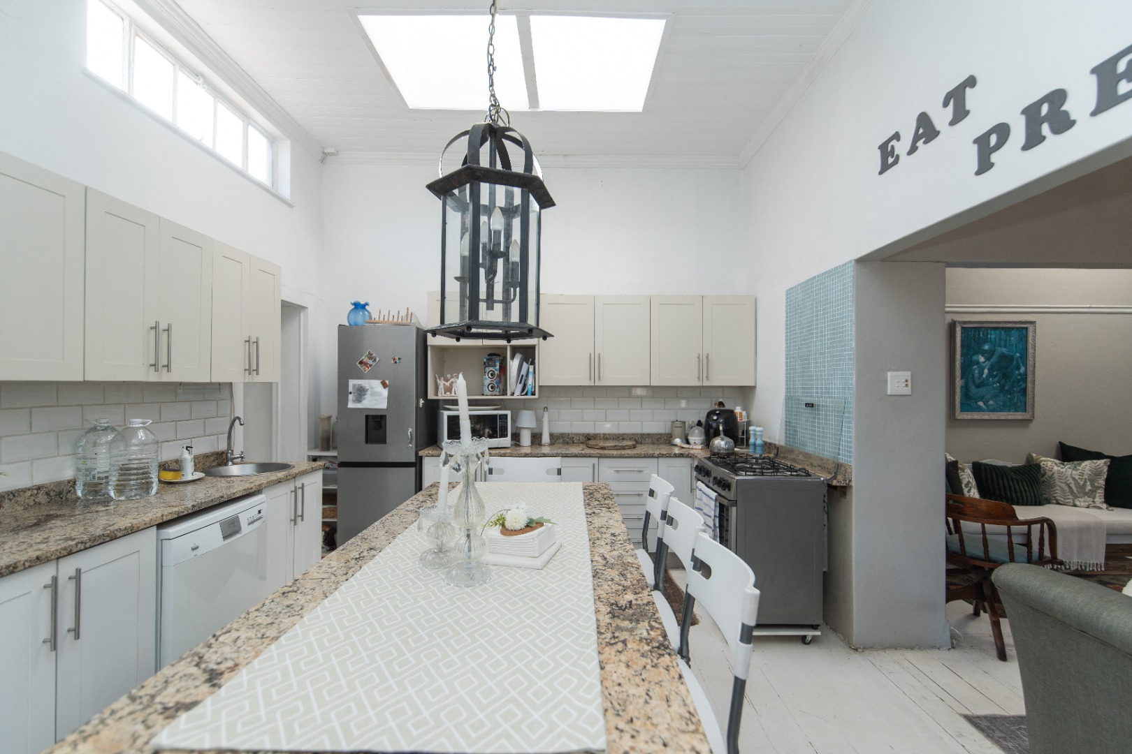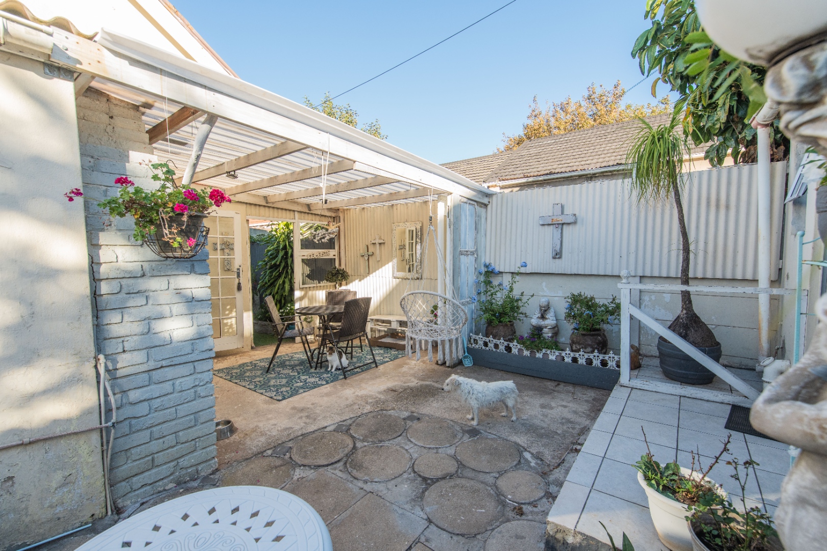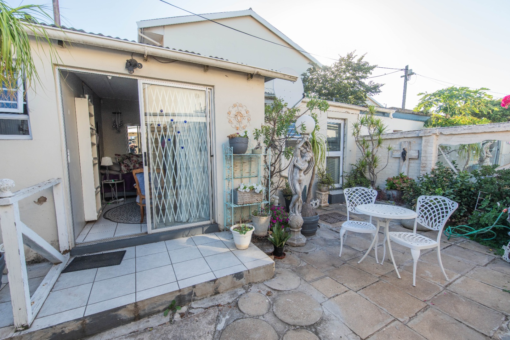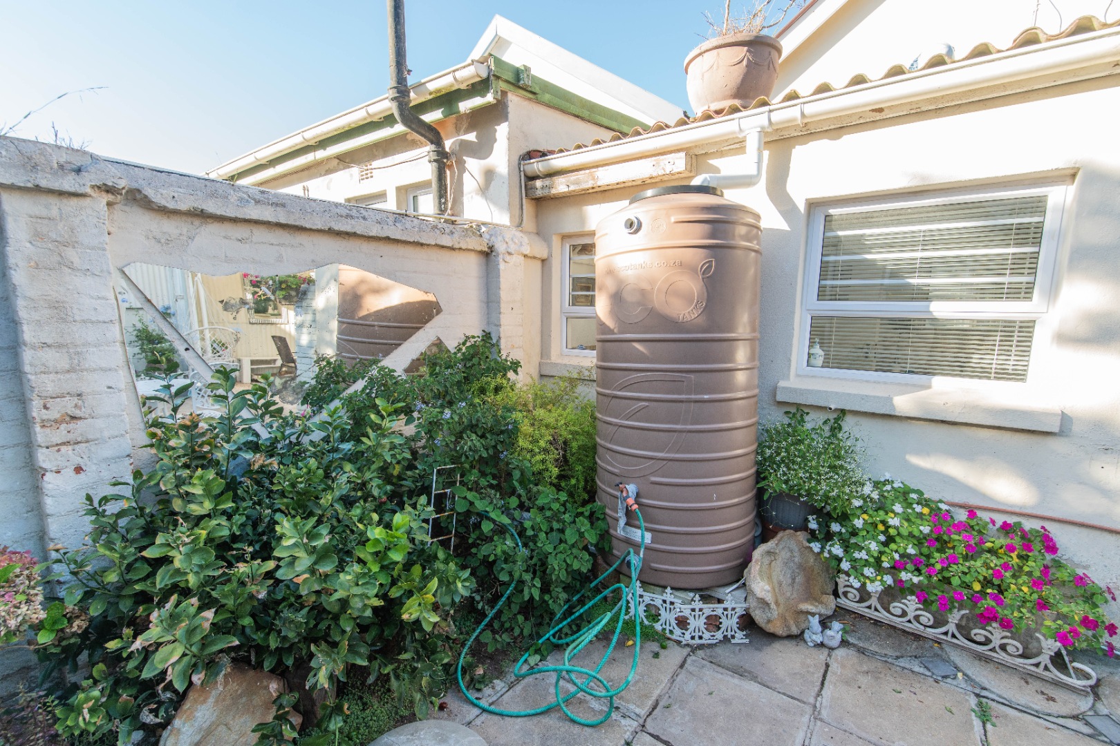 The kitchen opens to the back garden and private , cozy courtyard with an outdoor braai and slim line watertank.