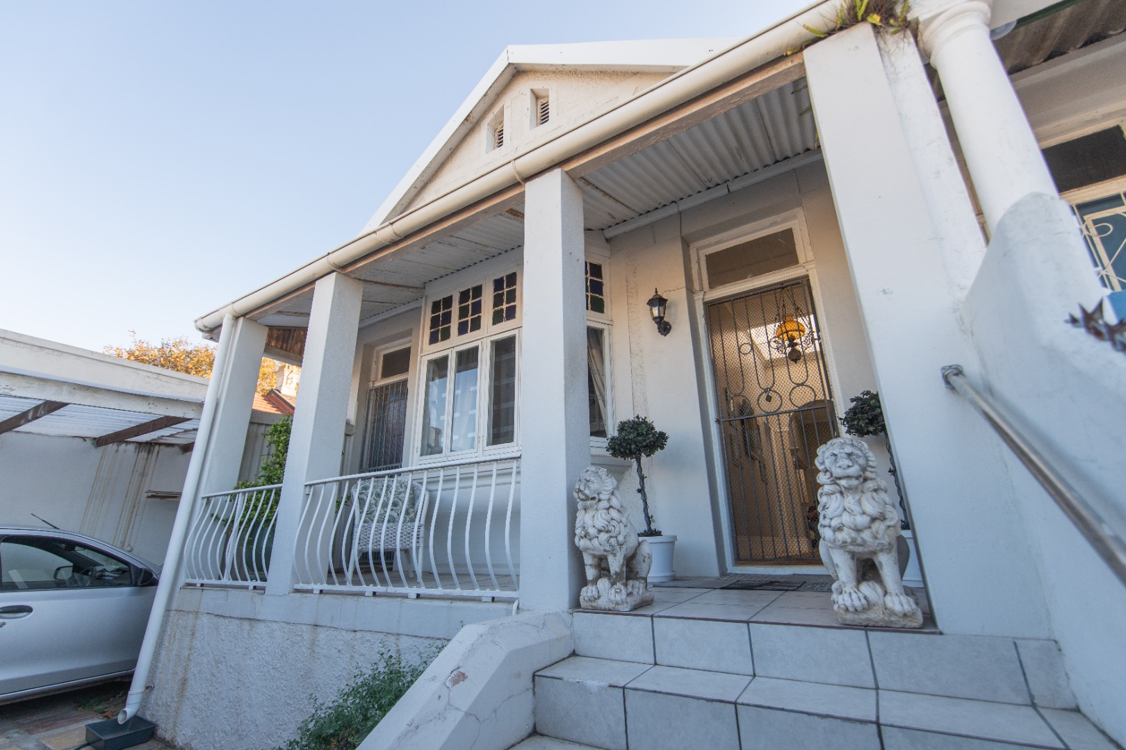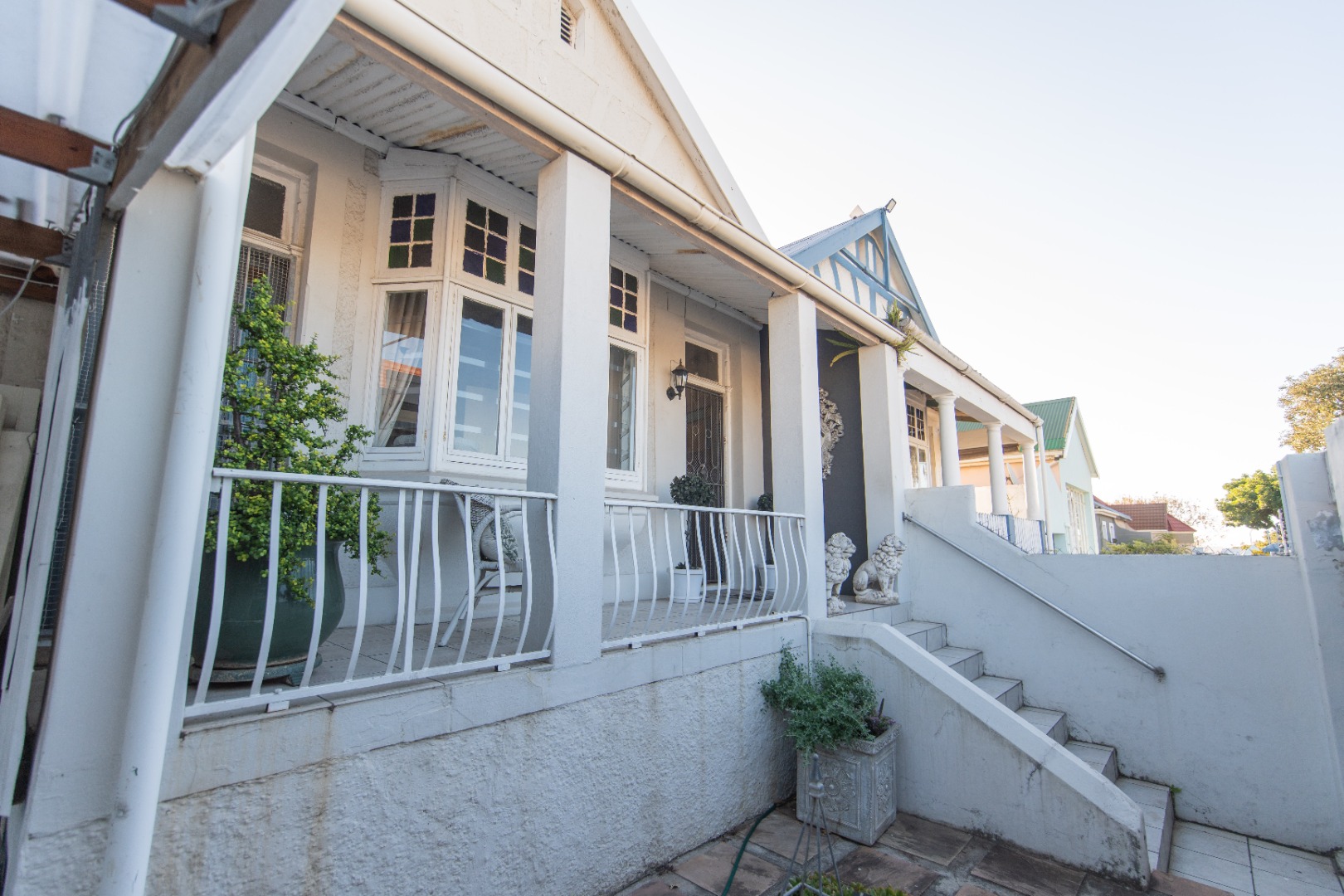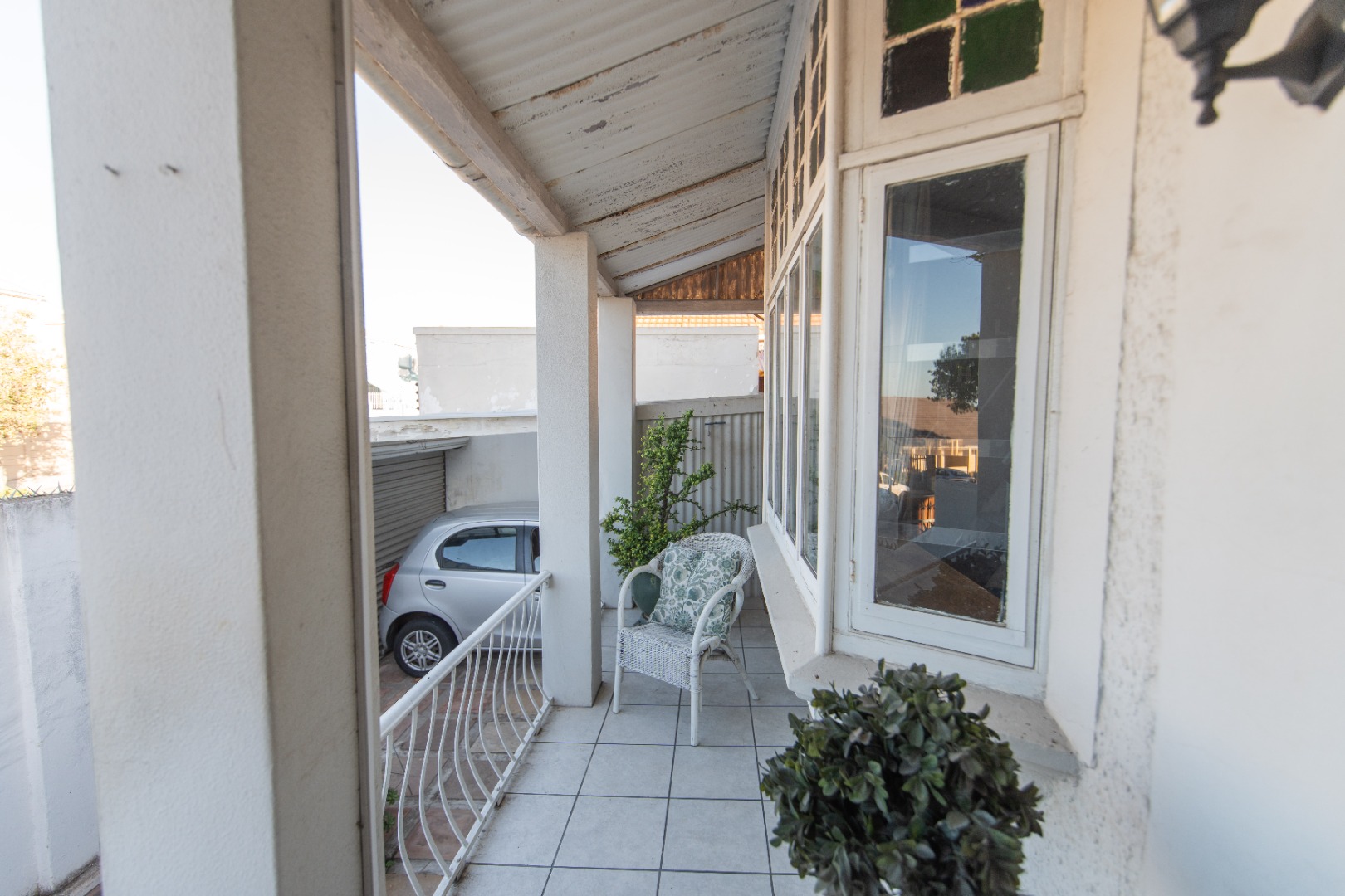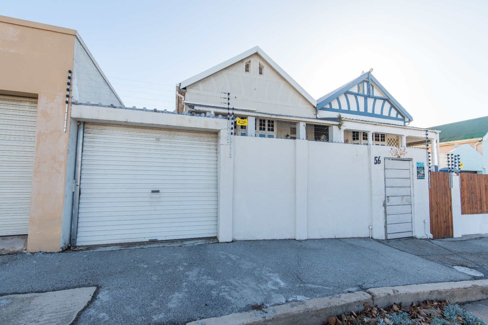 The front of the house has steps leading down to the newly fitted pedestrian gate and single garage on remote for a small vehicle, maximum of 5 meters and additional space for storage.
