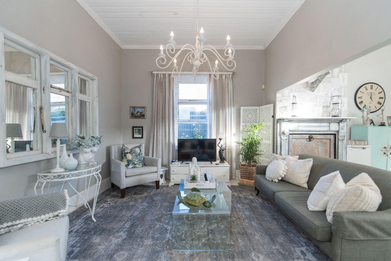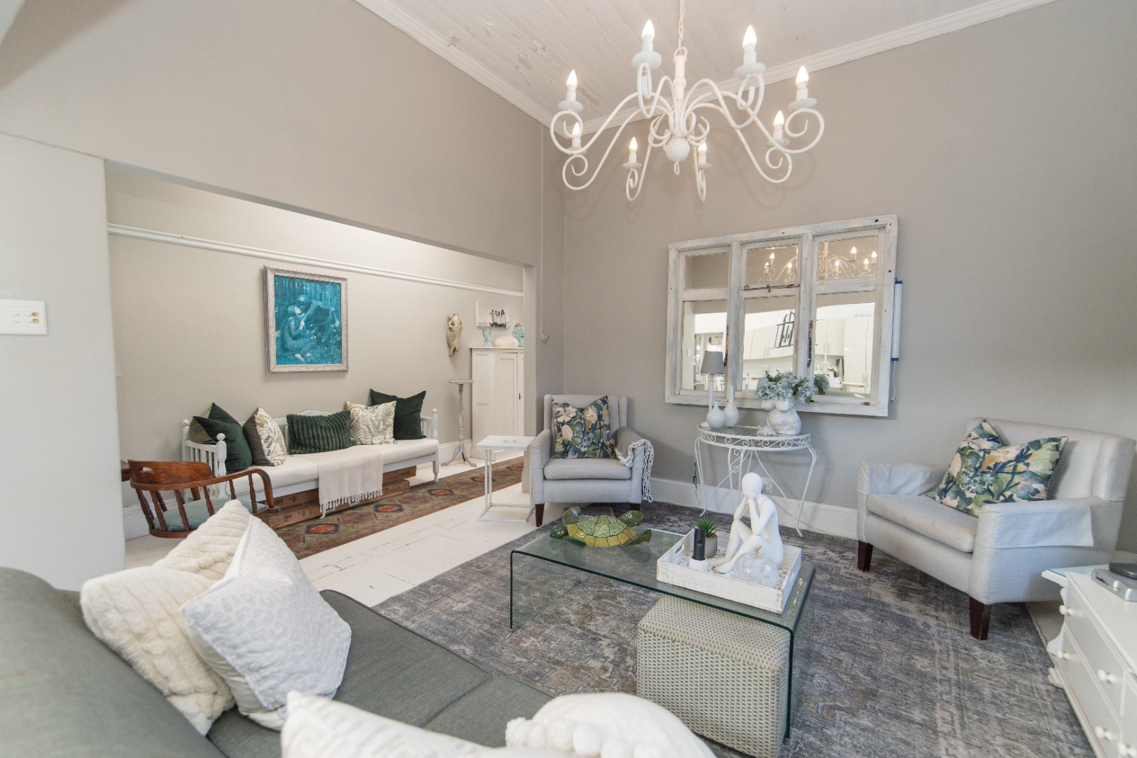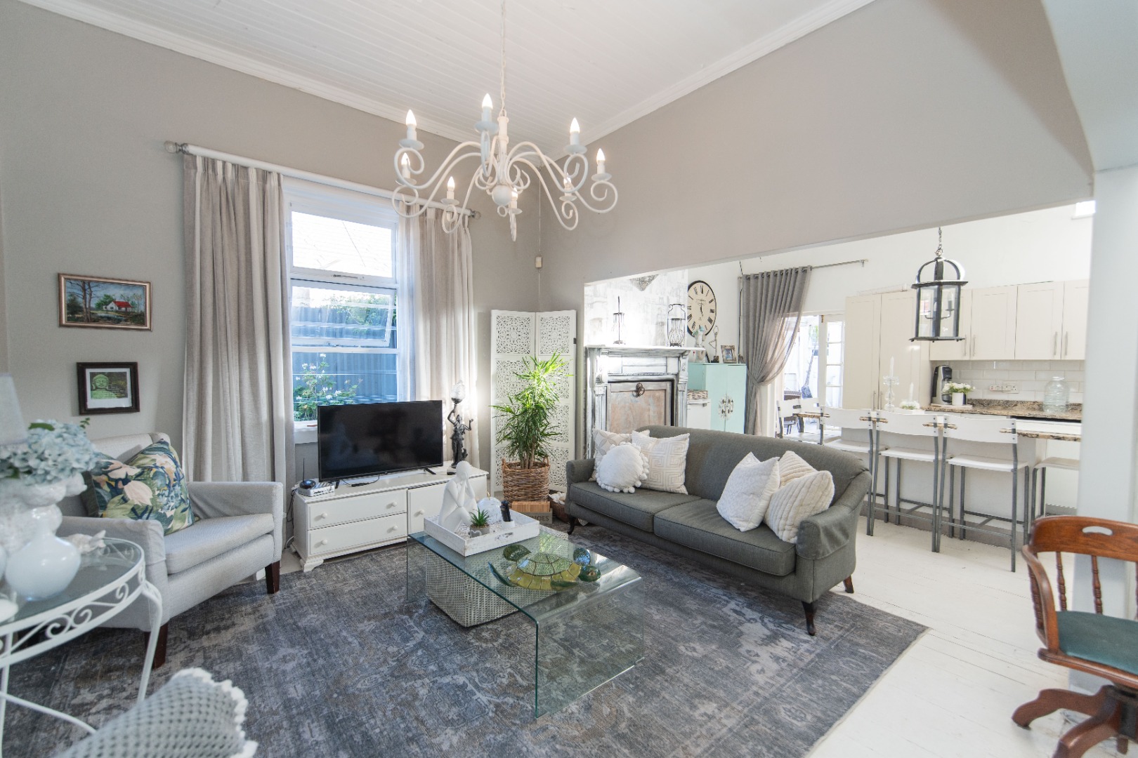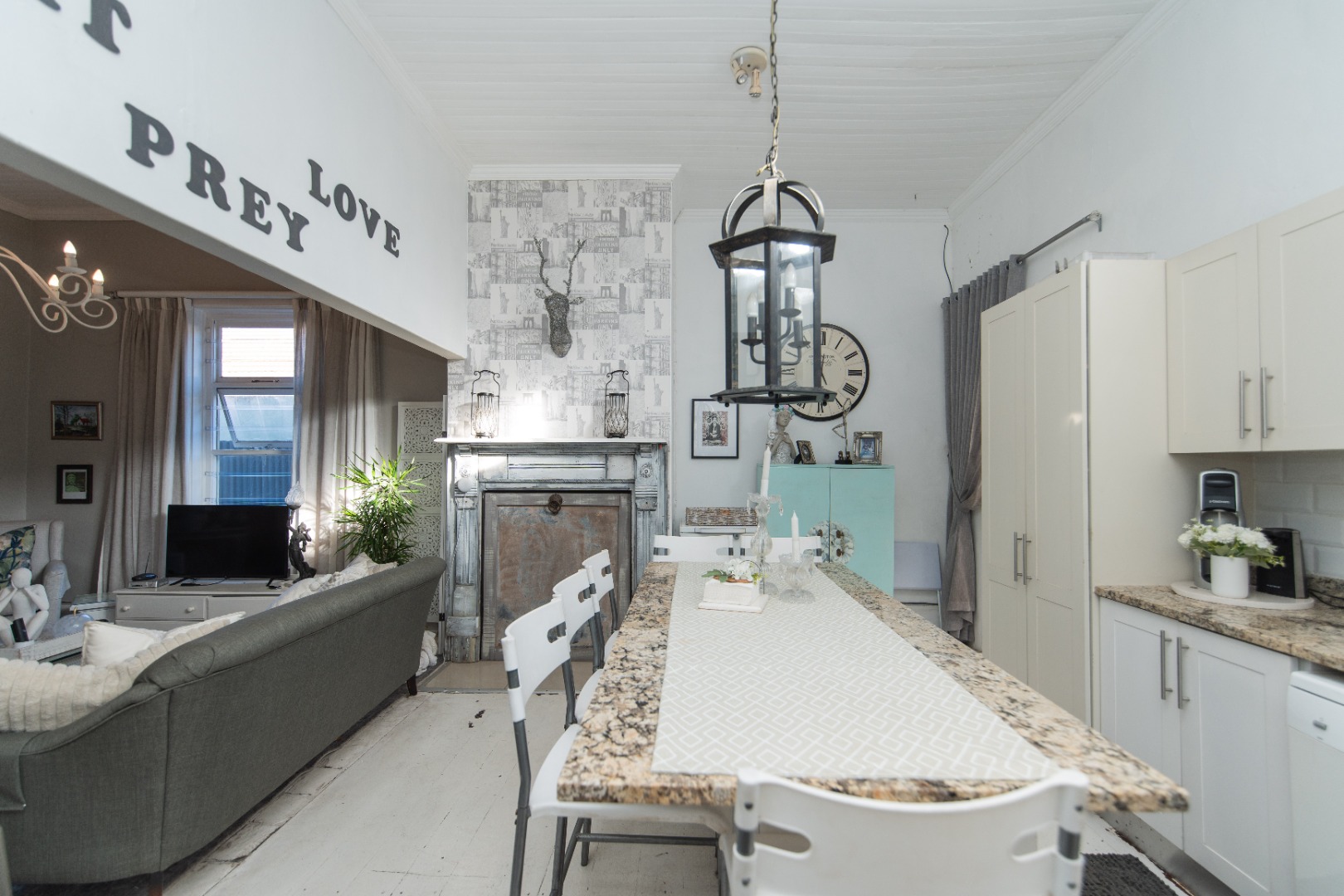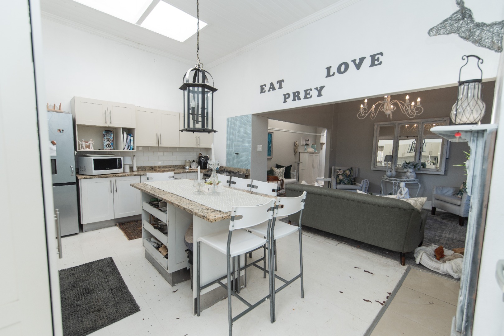 The home has a warm and modern feel with the wooden floors painted white, and beautiful light fittings.