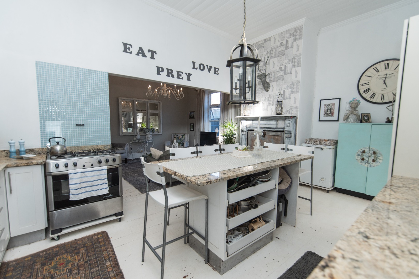 The living area is open plan to the kitchen with gas hob, granite counter tops and large centre island serving as the dining area and indoor fireplace. Leading off the kitchen is a laundry and bathroom with small corner bath and shower and a stylish vanity.