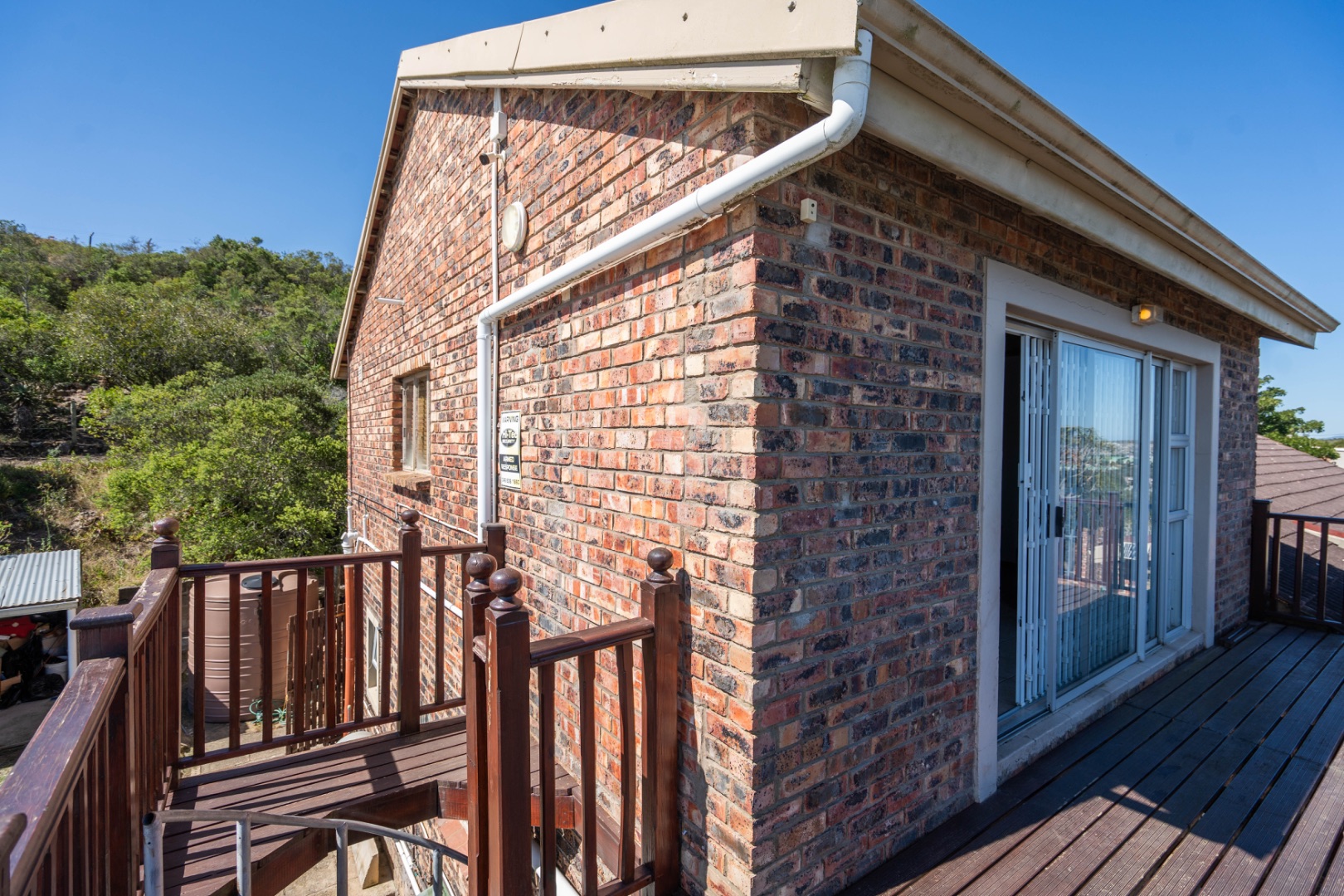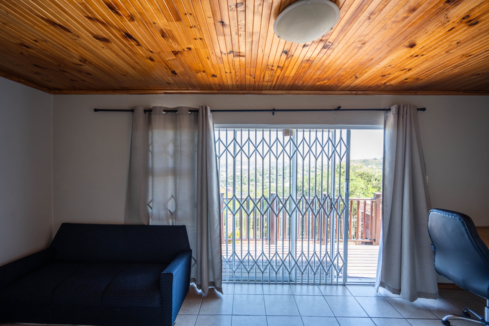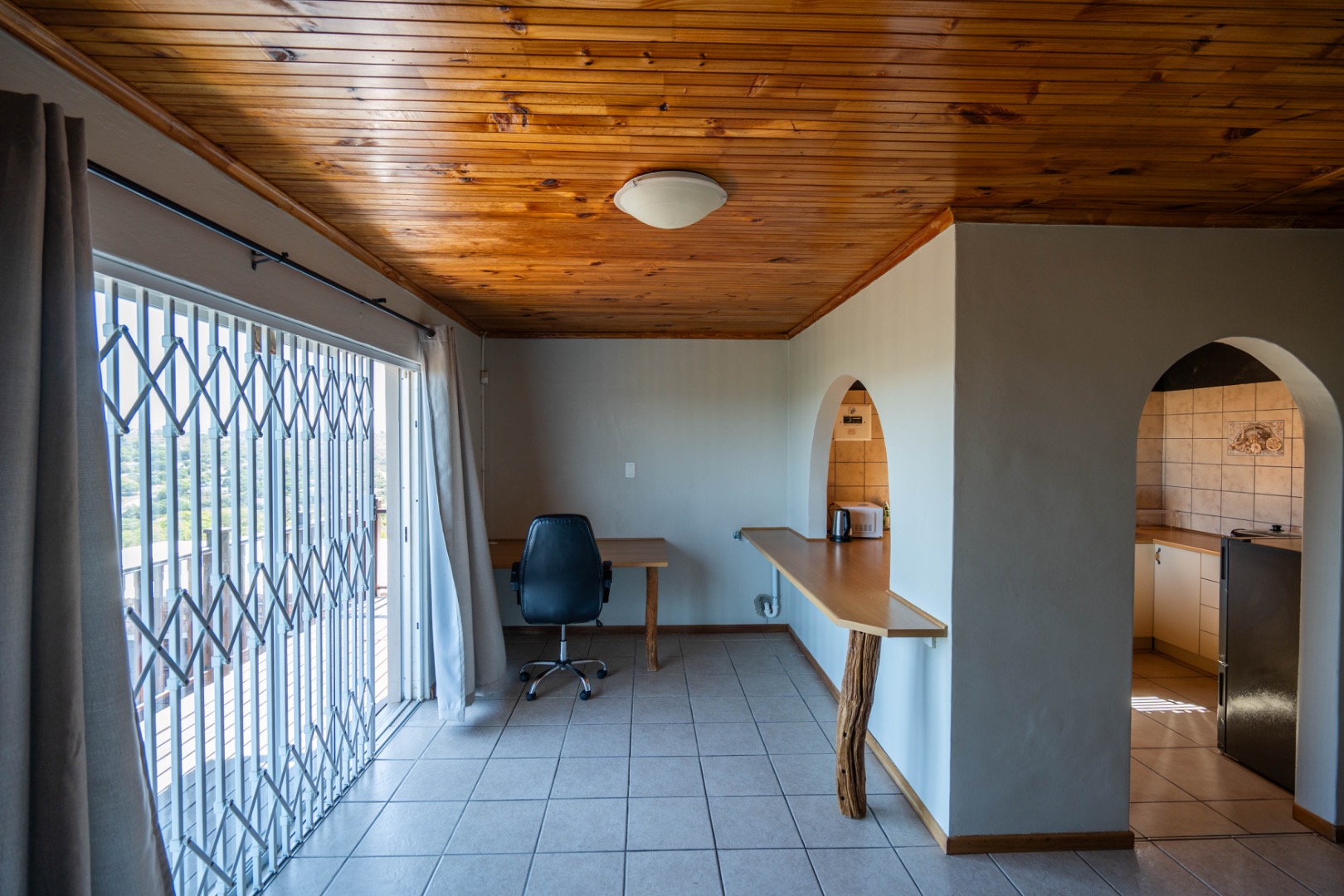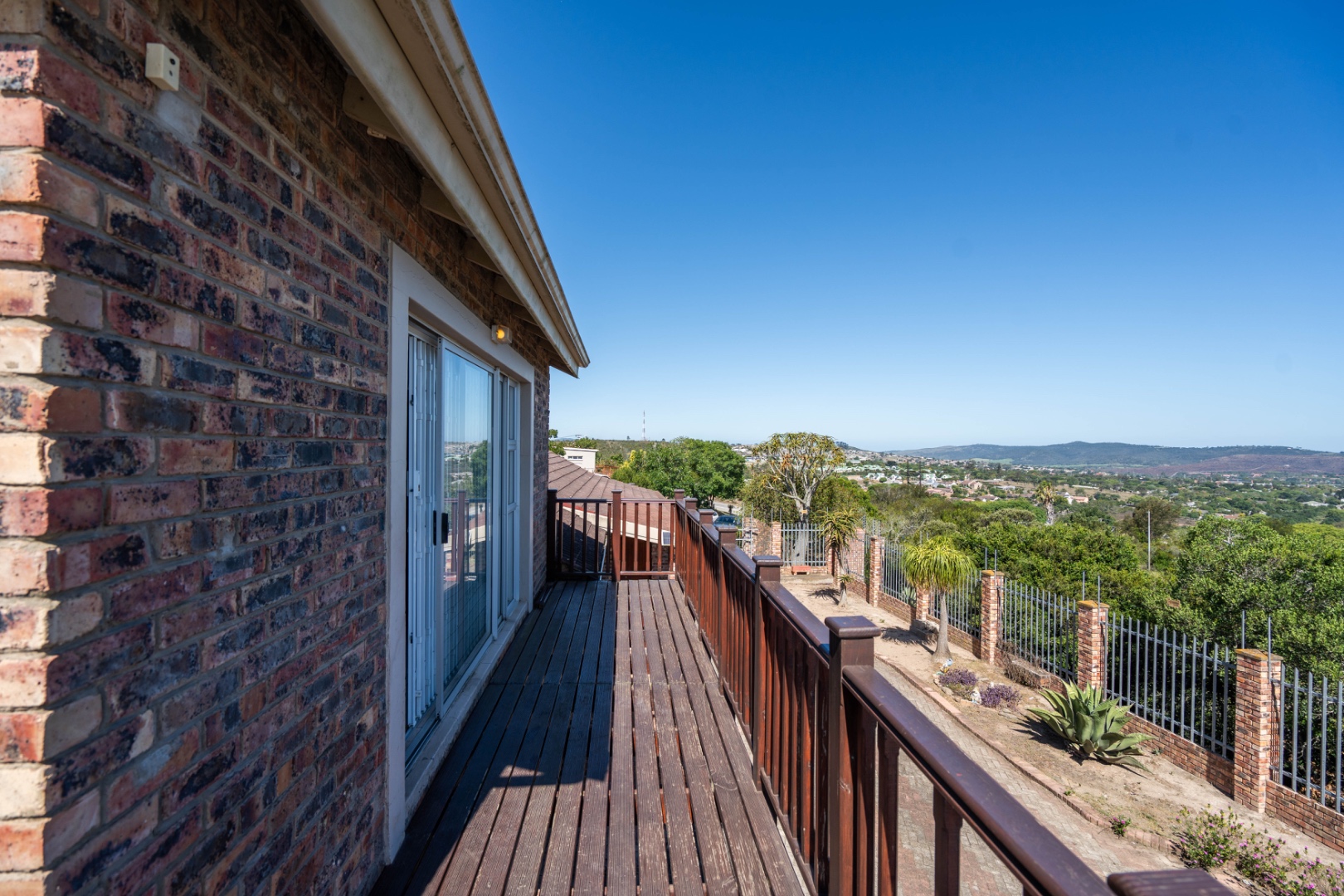 UPSTAIRS FLAT OFFERS: Magnificent view of Grahamstown. Spacious one bedroom with BIC and an open plan lounge/kitchen with aluminium doors leading out to a wooden deck which overlooks our city.