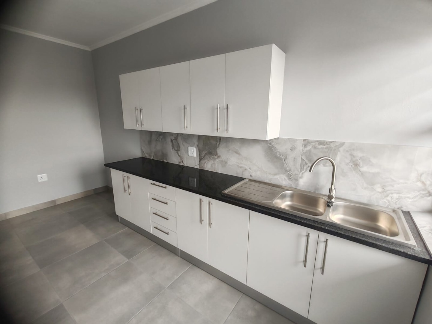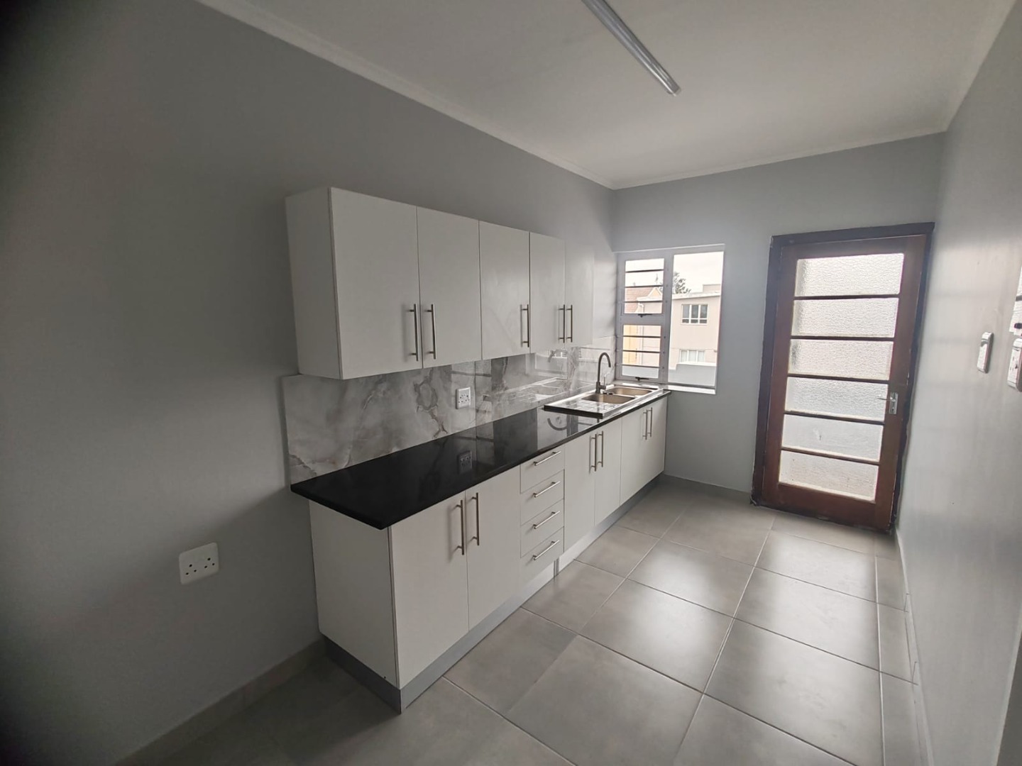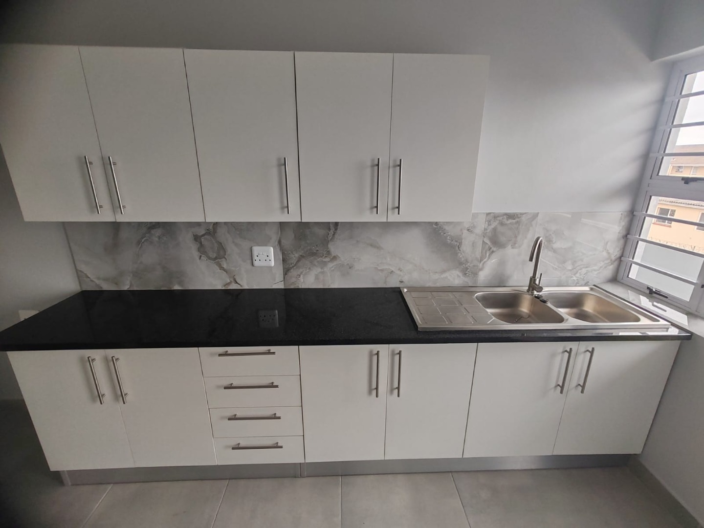 This modern 2-bedroom apartment, situated within a well-maintained complex in Parsons Hill, Port Elizabeth, offers a comfortable and secure living environment. The interior has been thoughtfully renovated, presenting a fresh and contemporary aesthetic. The heart of the home is its newly updated kitchen, featuring sleek white shaker-style cabinets, contrasting black countertops, and a stylish marble-patterned backsplash. A double stainless steel sink and modern faucet complete this functional space, which benefits from ample natural light.