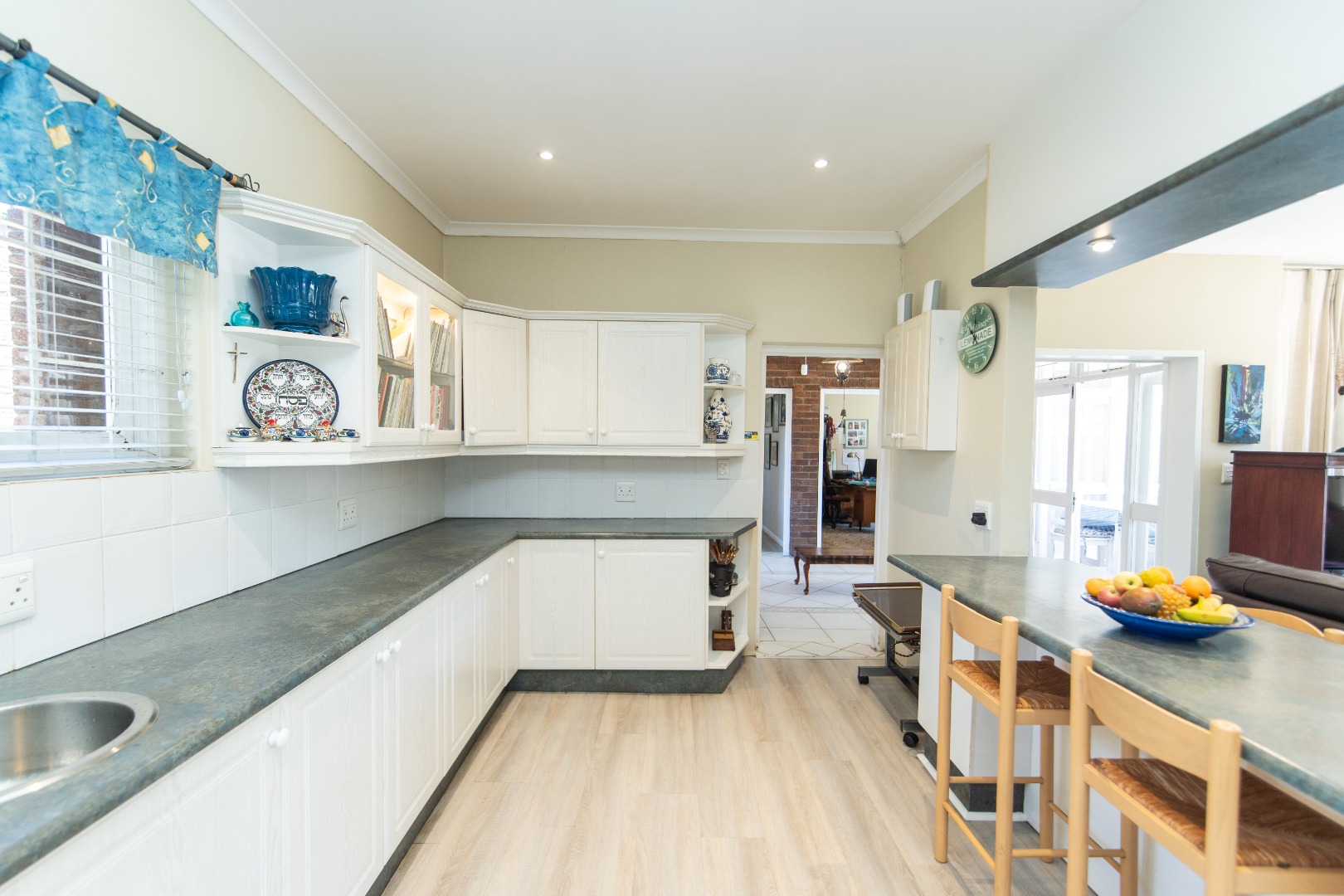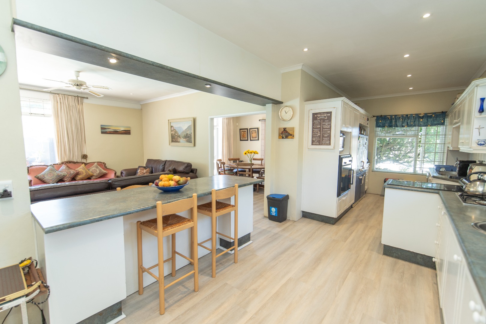 Discover this inviting 3-bedroom, 3-bathroom residence available for rent in the desirable suburban area of Summerstrand, Port Elizabeth. This home offers a comfortable and functional layout, ideal for modern living. The interior features an open-plan design, seamlessly connecting the spacious lounge, dining area, and kitchen. Natural light floods these areas, enhanced by light-colored laminate flooring and neutral wall tones. The kitchen is well-appointed with white cabinetry, light wood-look flooring, and an integrated breakfast bar, providing ample space for meal preparation and casual dining. A dedicated study overlooking the garden, offers a quiet space for work or hobbies. The property also boasts a bright entryway or sunroom with charming exposed brick walls and direct access to the outdoor garden.