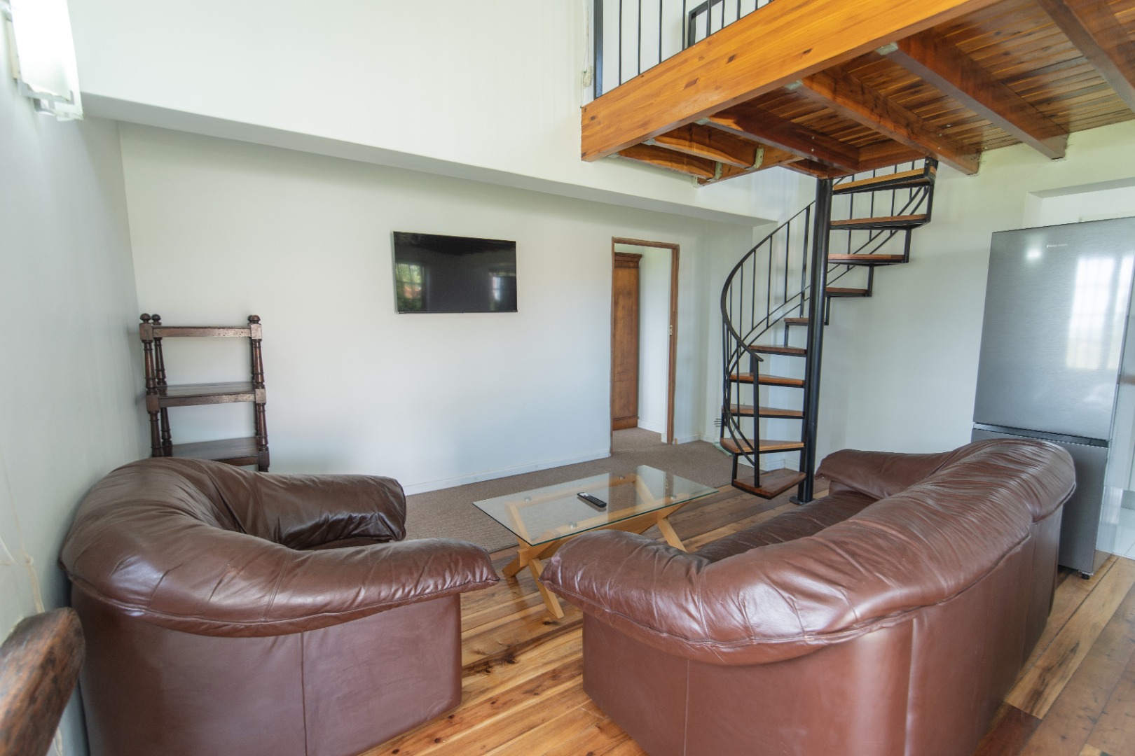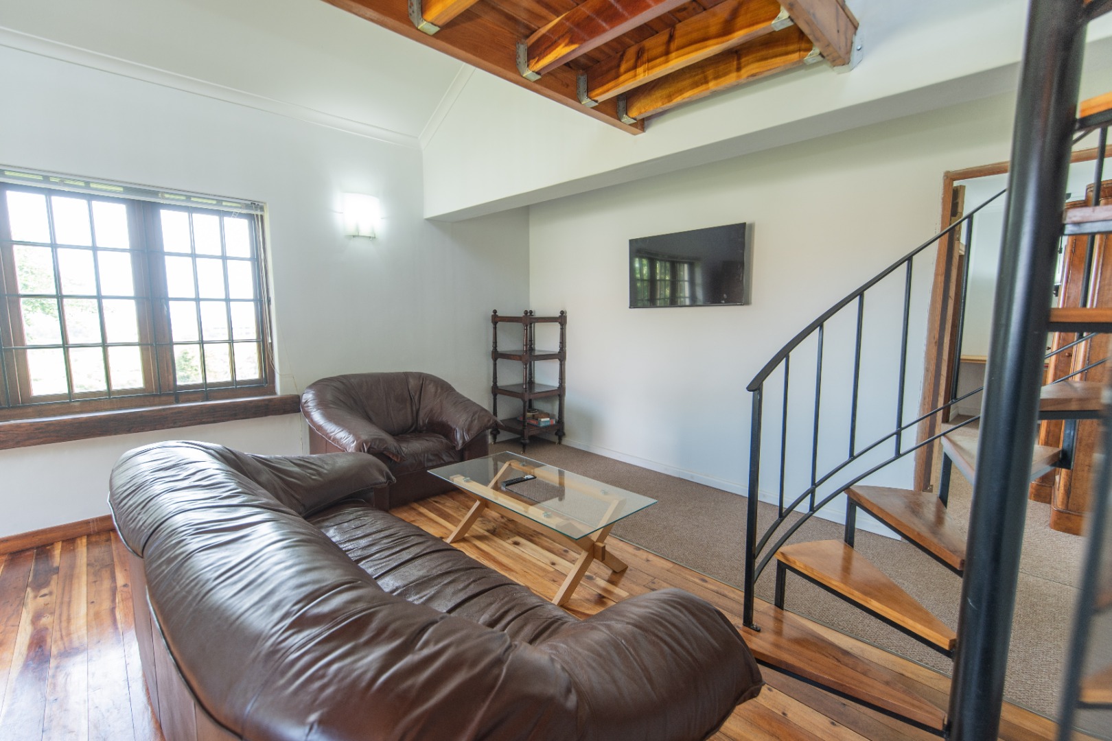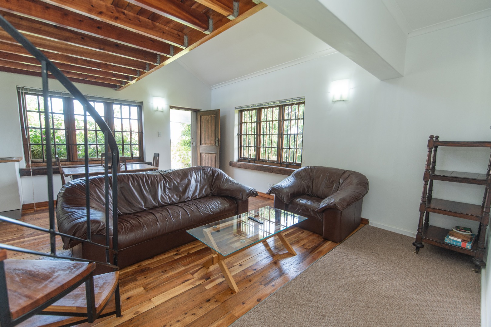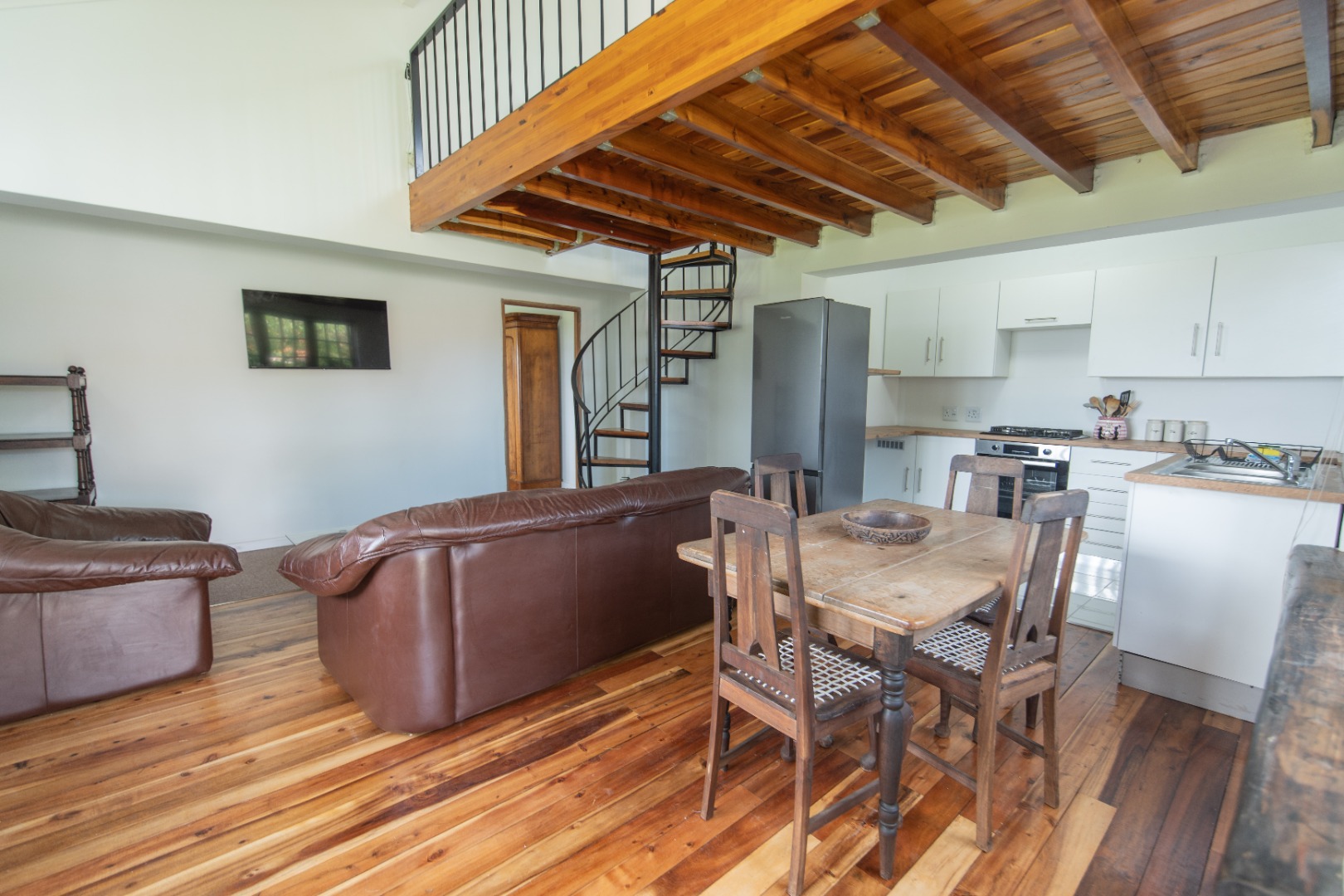 Discover this charming 1-bedroom, 1-bathroom furnished residence available for rent in the desirable suburban area of Walmer Heights, Port Elizabeth. This inviting home features an open-plan layout, creating a spacious and cohesive living environment. The interior boasts beautiful hardwood floors, high ceilings with exposed wooden beams, and abundant natural light, enhancing the overall sense of warmth and character. A unique spiral staircase adds an architectural focal point, leading to a versatile loft area.