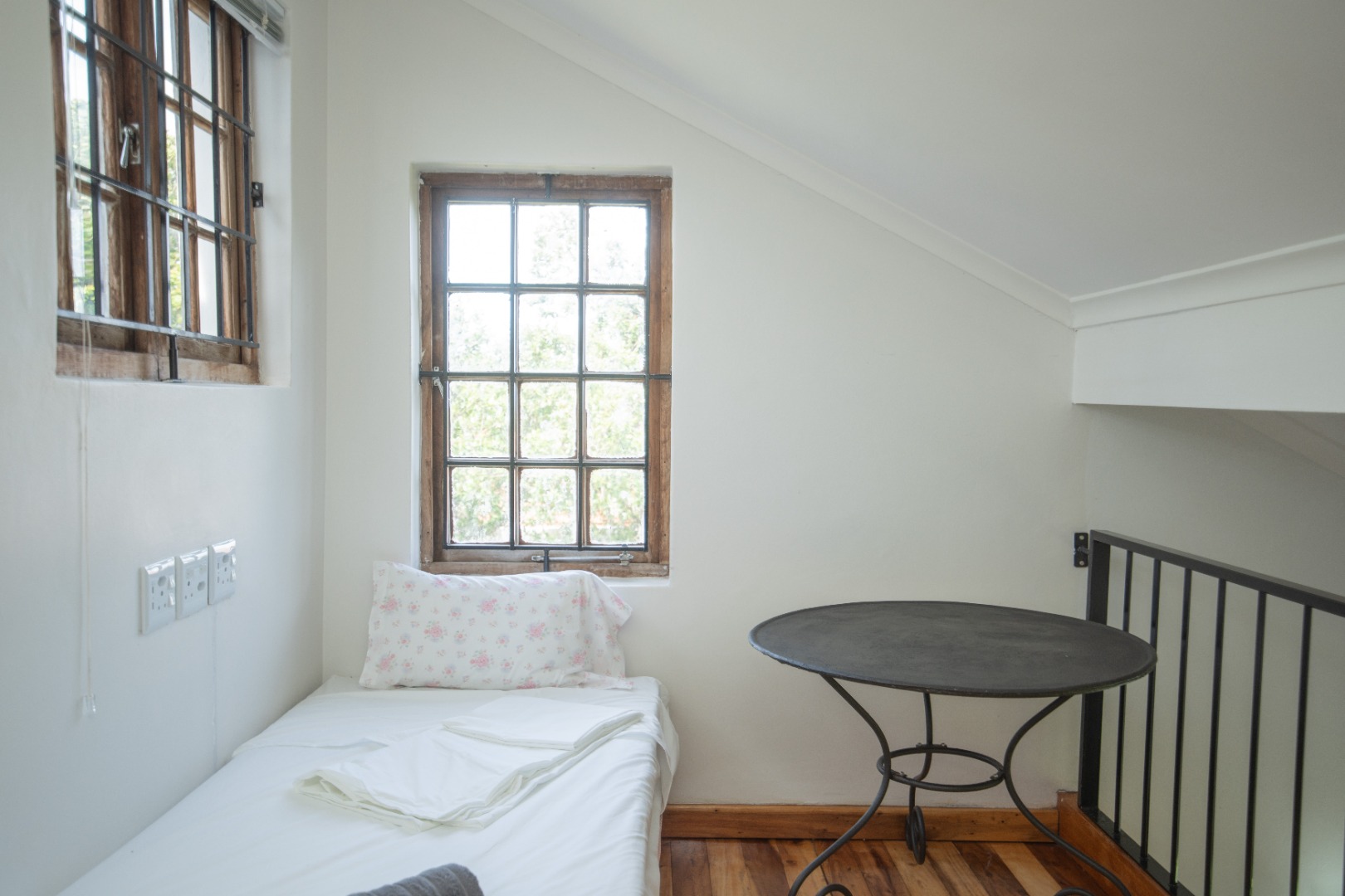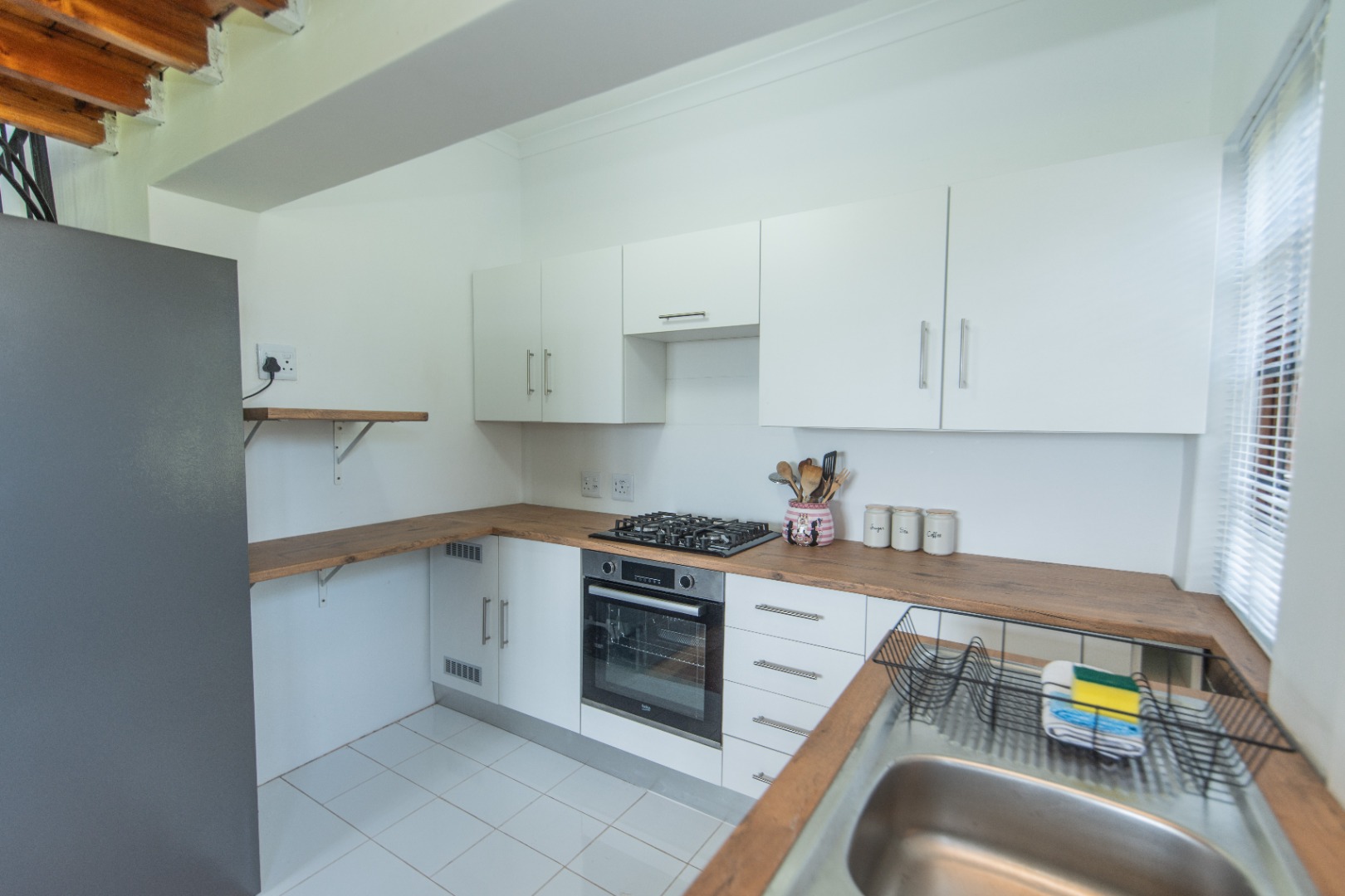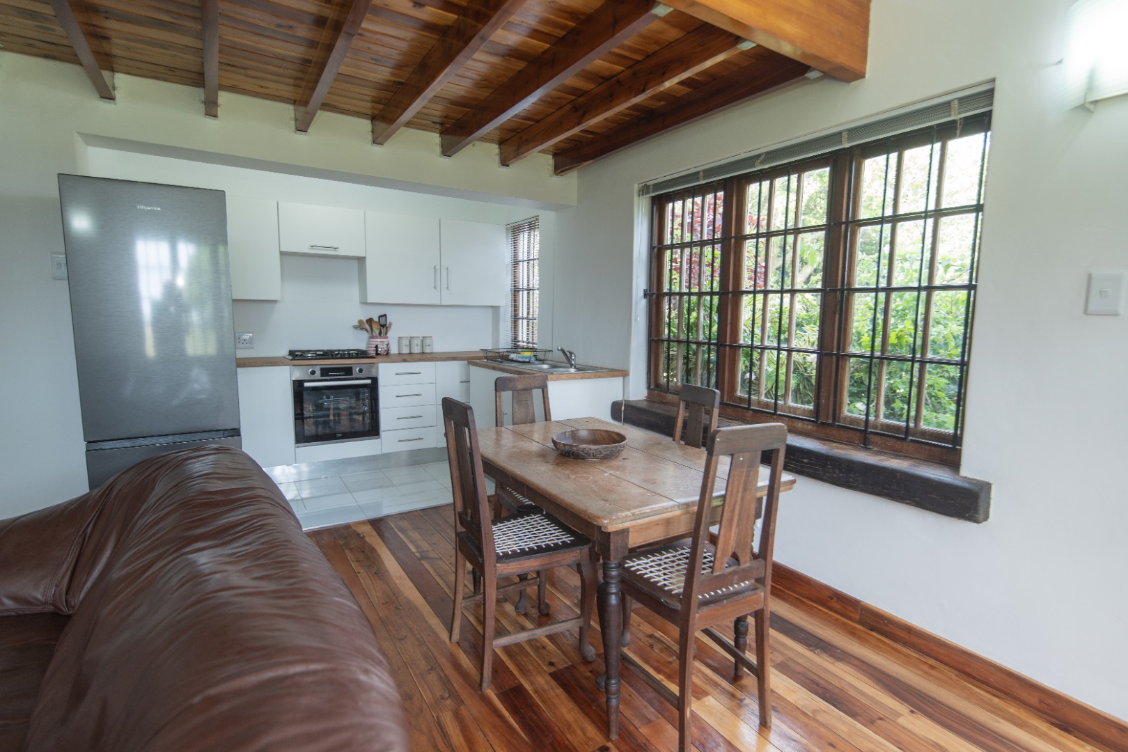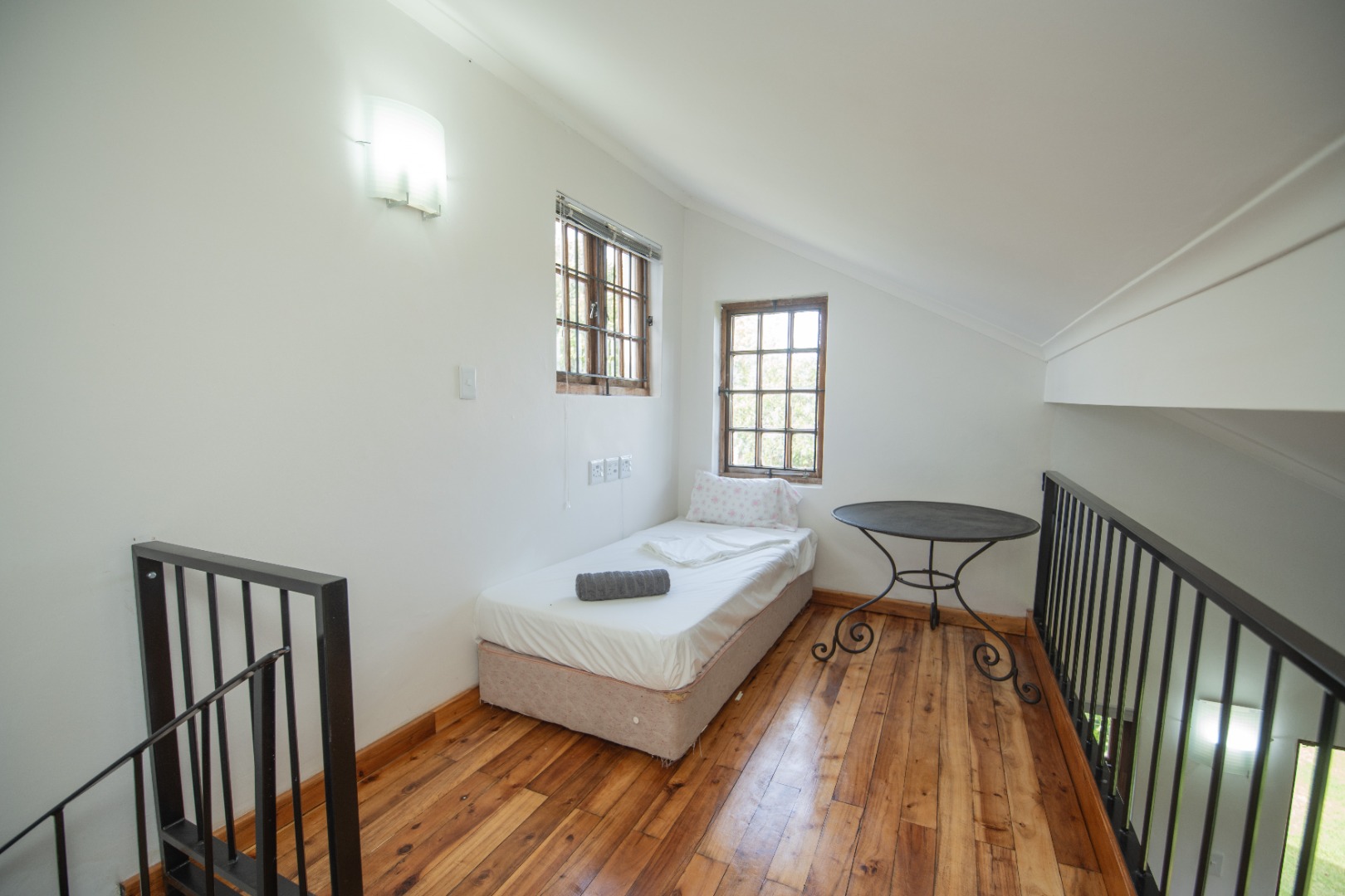 Discover this charming 1-bedroom, 1-bathroom furnished residence available for rent in the desirable suburban area of Walmer Heights, Port Elizabeth. This inviting home features an open-plan layout, creating a spacious and cohesive living environment. The interior boasts beautiful hardwood floors, high ceilings with exposed wooden beams, and abundant natural light, enhancing the overall sense of warmth and character. A unique spiral staircase adds an architectural focal point, leading to a versatile loft area.