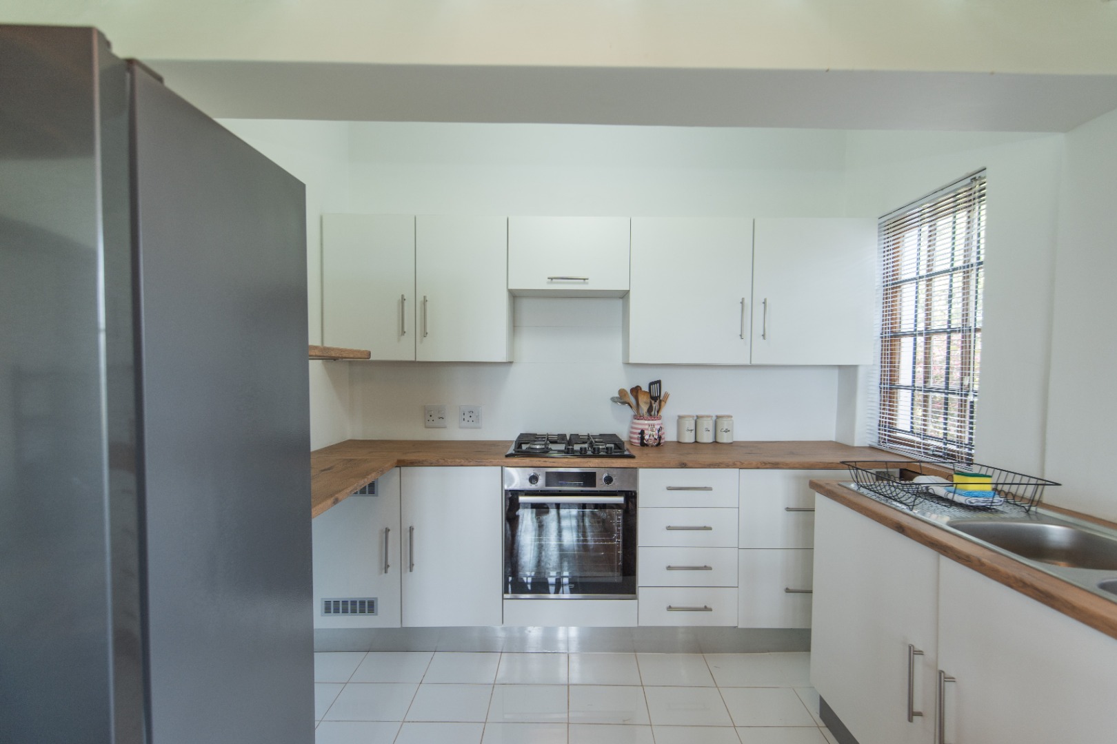 The functional kitchen is well-appointed with modern white cabinetry, wood-look countertops, an integrated oven, and a gas hob, catering to your culinary needs. The living and dining areas are designed for comfortable daily living, offering a seamless flow. While furnished, the property provides a canvas for personal touches, ideal for a professional individual or couple seeking a convenient, ready-to-move-in solution.