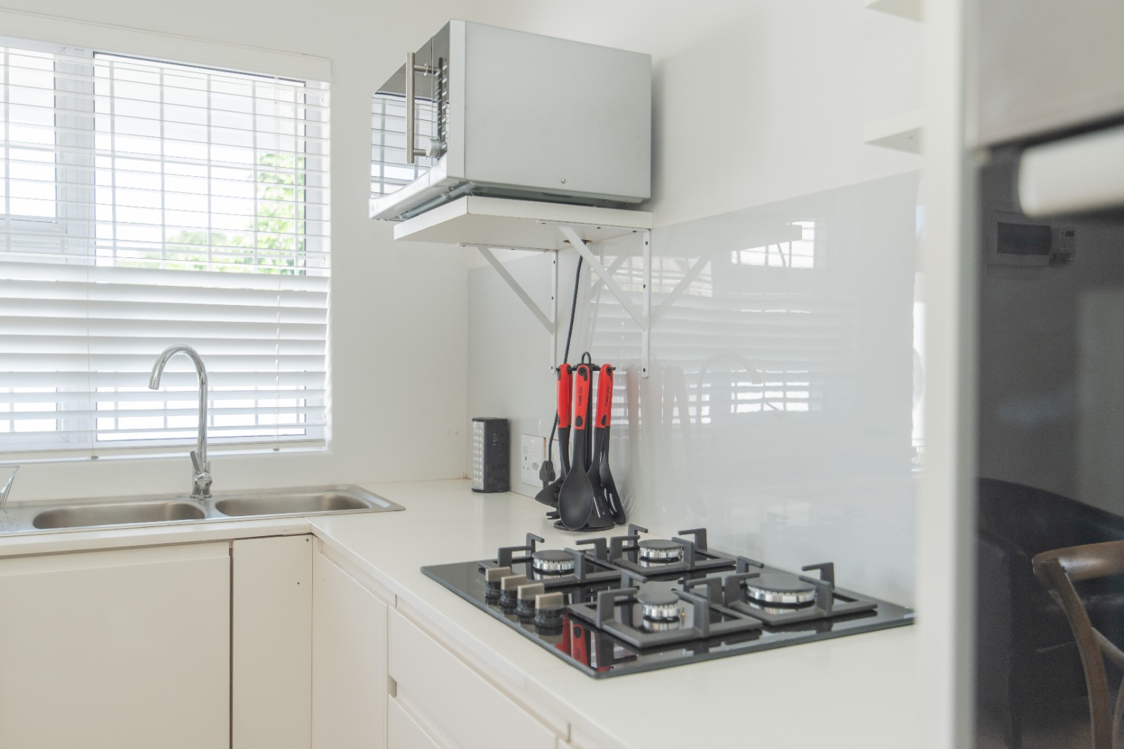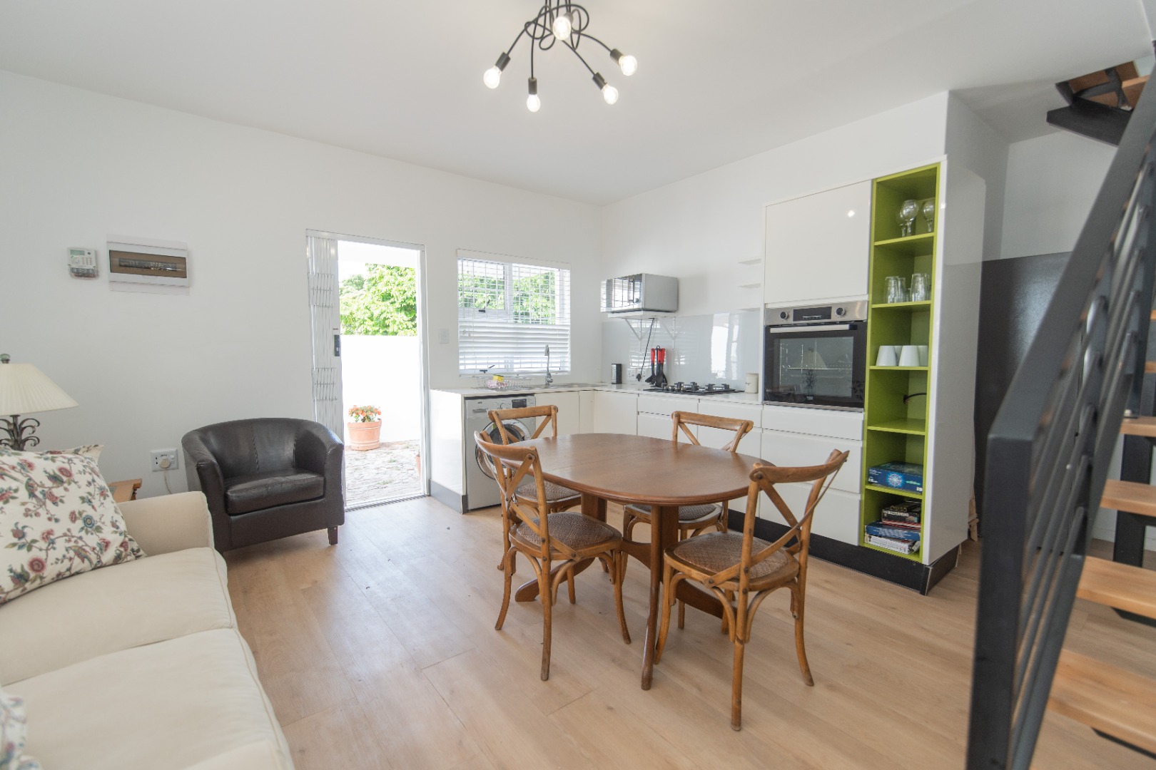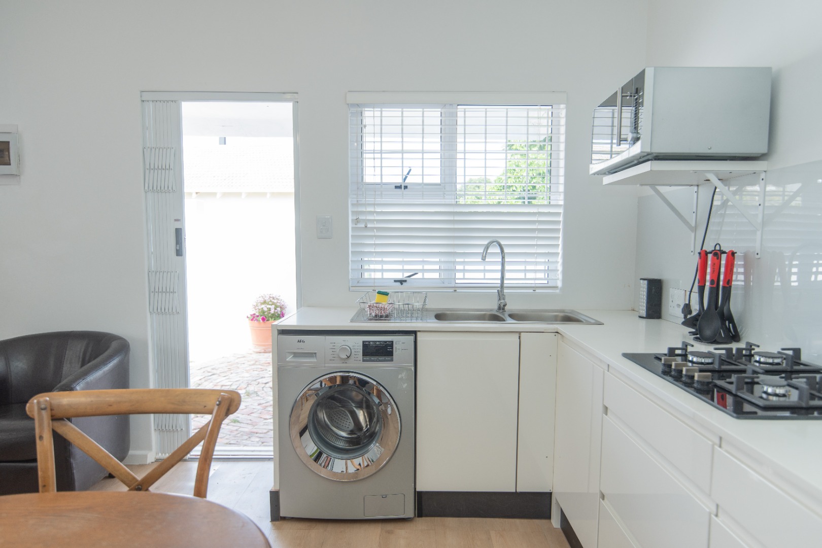 Discover this inviting 2-bedroom, 1-bathroom residence available for rent in the desirable suburban area of Walmer Heights, Port Elizabeth. Designed for comfortable living, this furnished home features an open-plan layout that seamlessly connects the living, dining, and kitchen areas, creating a bright and airy atmosphere. The modern kitchen is well-appointed with white cabinetry, a gas hob, integrated oven, and a washing machine, complemented by stylish lime green open shelving. Natural light floods the space, enhancing its contemporary appeal.