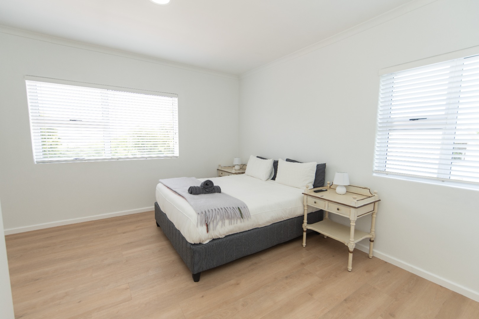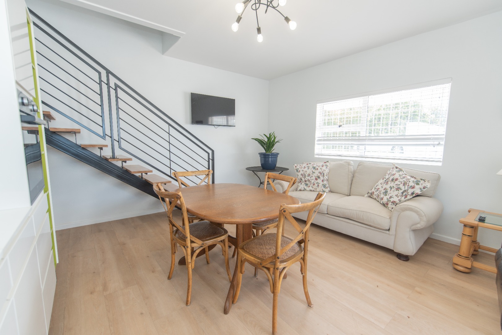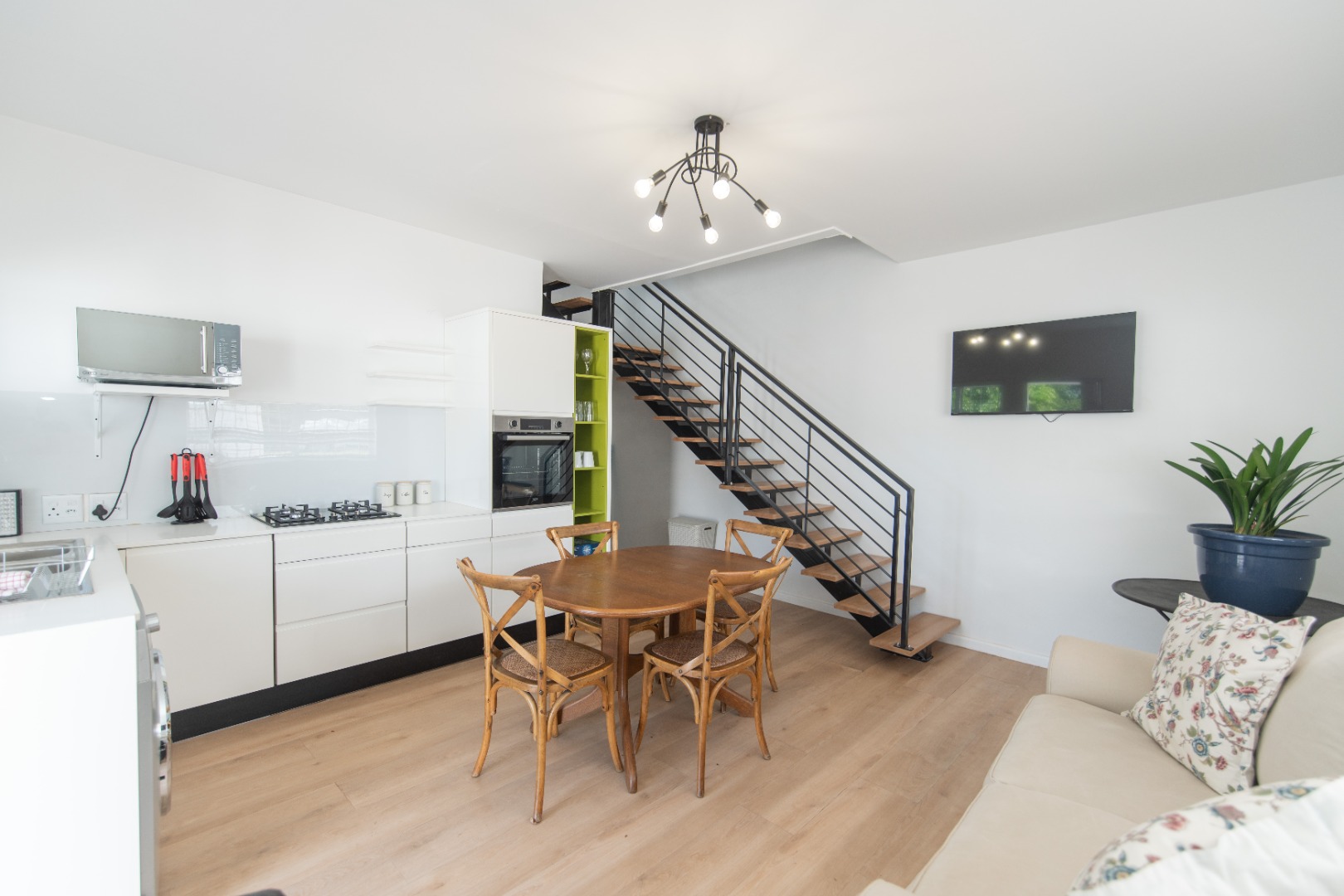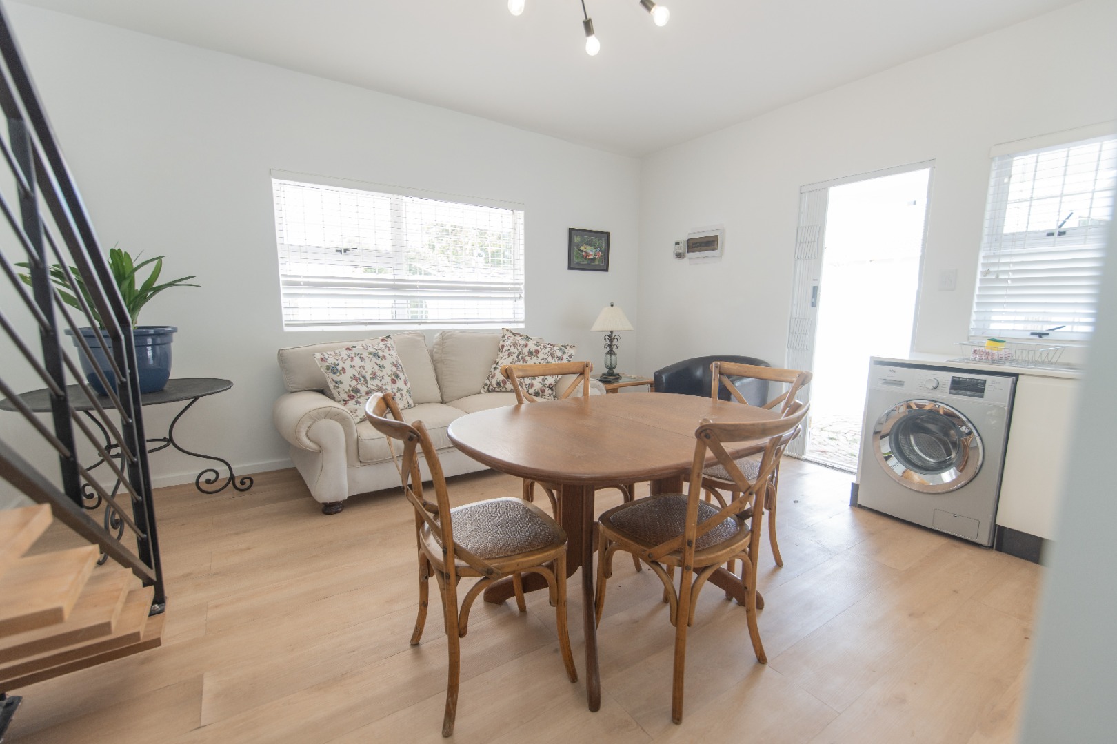 Discover this inviting 2-bedroom, 1-bathroom residence available for rent in the desirable suburban area of Walmer Heights, Port Elizabeth. Designed for comfortable living, this furnished home features an open-plan layout that seamlessly connects the living, dining, and kitchen areas, creating a bright and airy atmosphere. The modern kitchen is well-appointed with white cabinetry, a gas hob, integrated oven, and a washing machine, complemented by stylish lime green open shelving. Natural light floods the space, enhancing its contemporary appeal.
