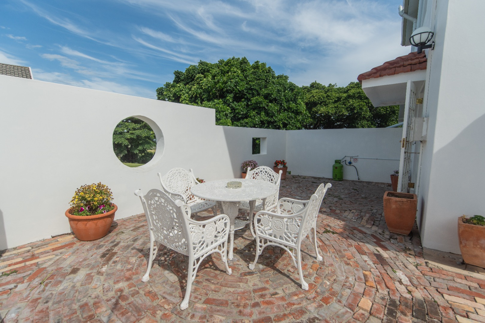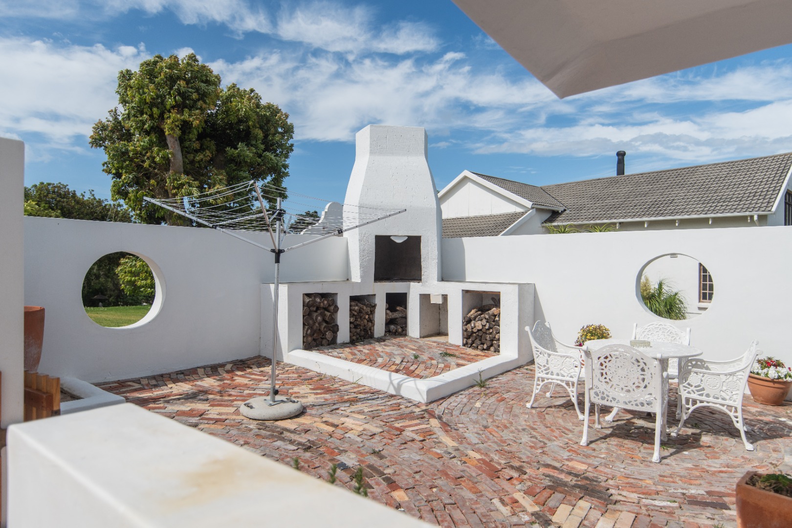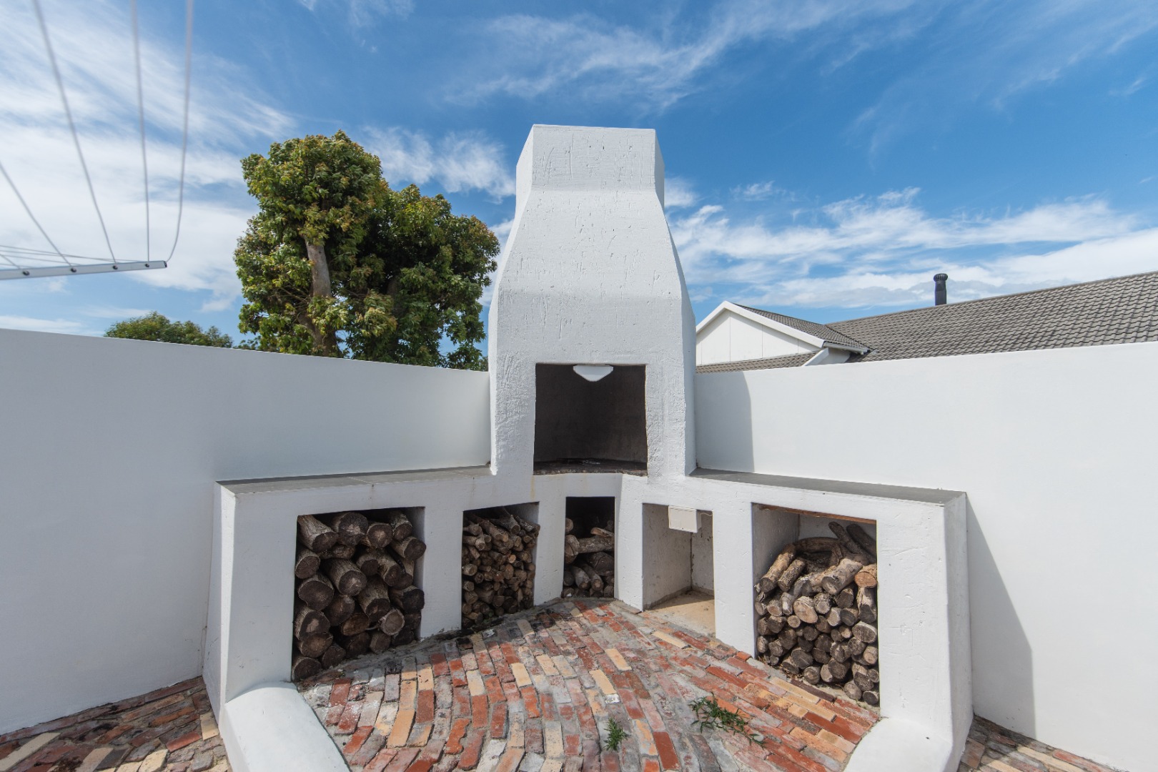 Step outside to a private, paved outdoor area, perfect for relaxation and entertaining. This charming space boasts a built-in braai with integrated wood storage, ideal for enjoying South African outdoor living. Unique architectural details, including circular cutouts in the walls, add character to the exterior. The property also benefits from a solar geyser, contributing to energy efficiency, and is equipped with burglar bars for enhanced security.