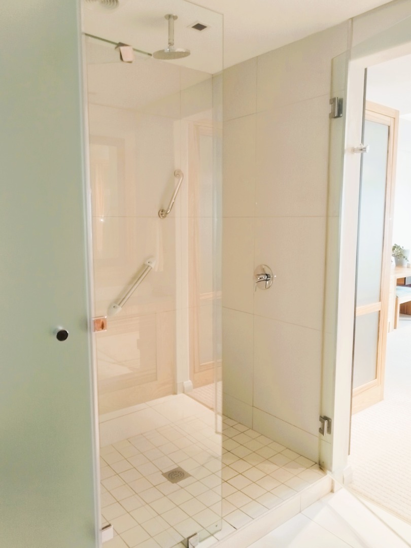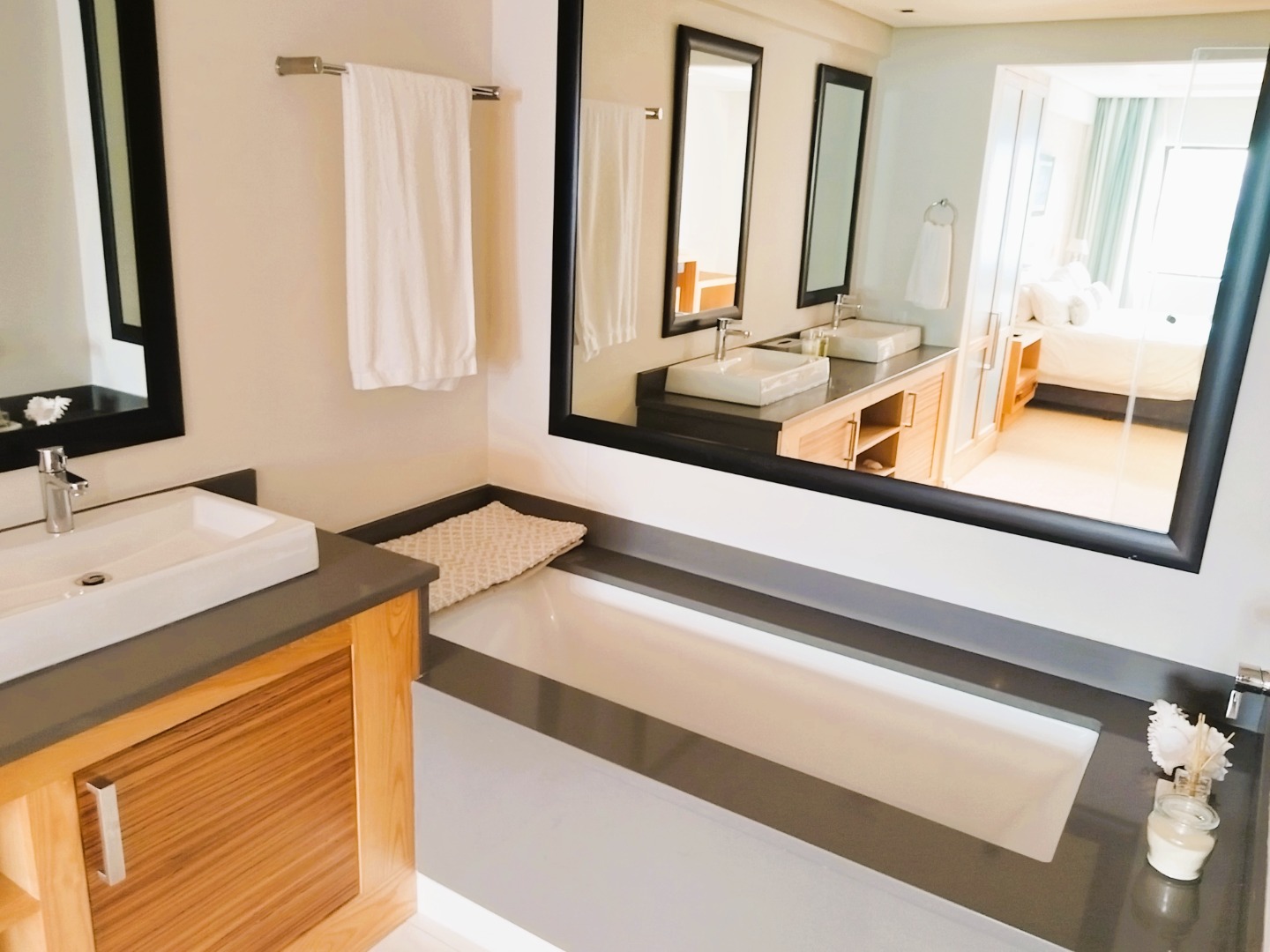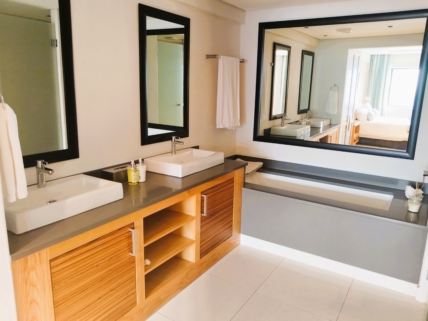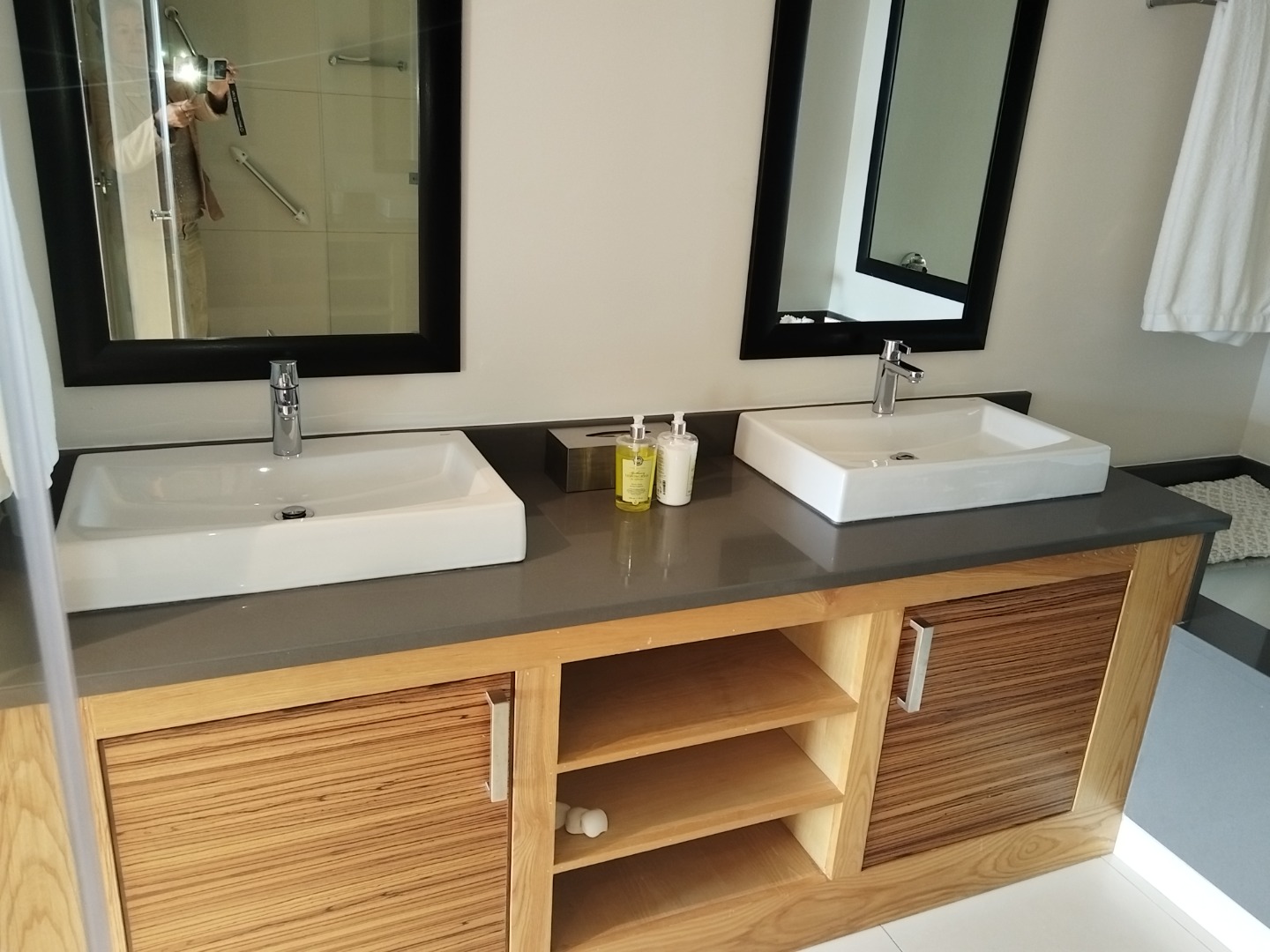 - En-suite bathroom with walk-in shower, bath, His and Hers vanity, toilet. The stylish bathroom vanity is super sleek, dual sinks with grey countertops, wooden cabinets, and the black-framed mirrors give it a modern vibe.