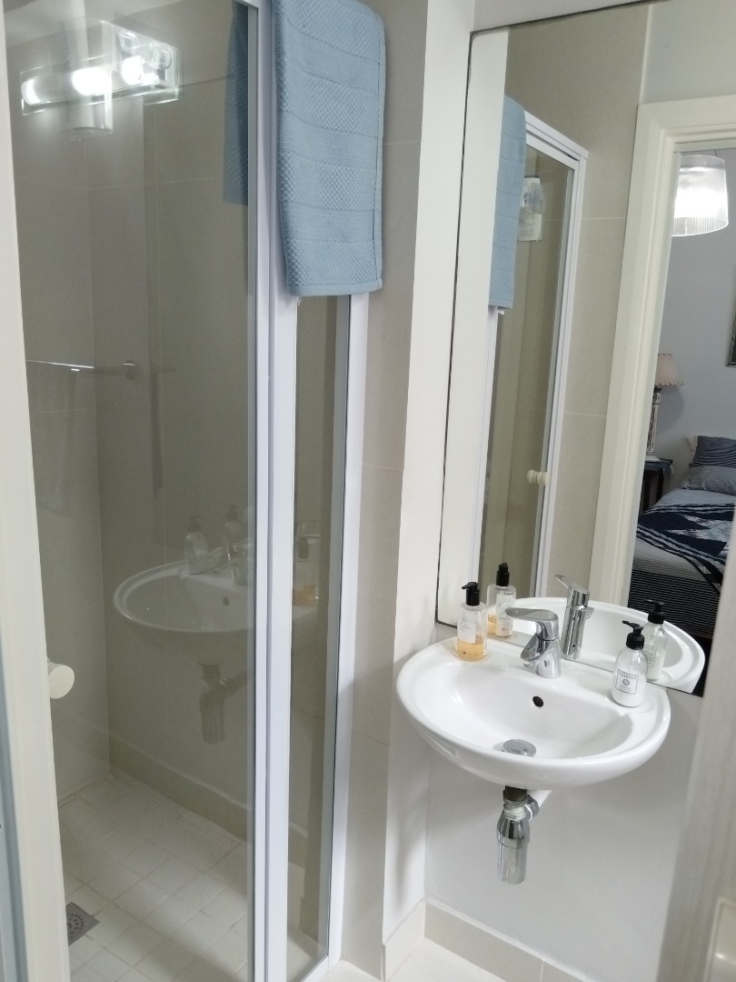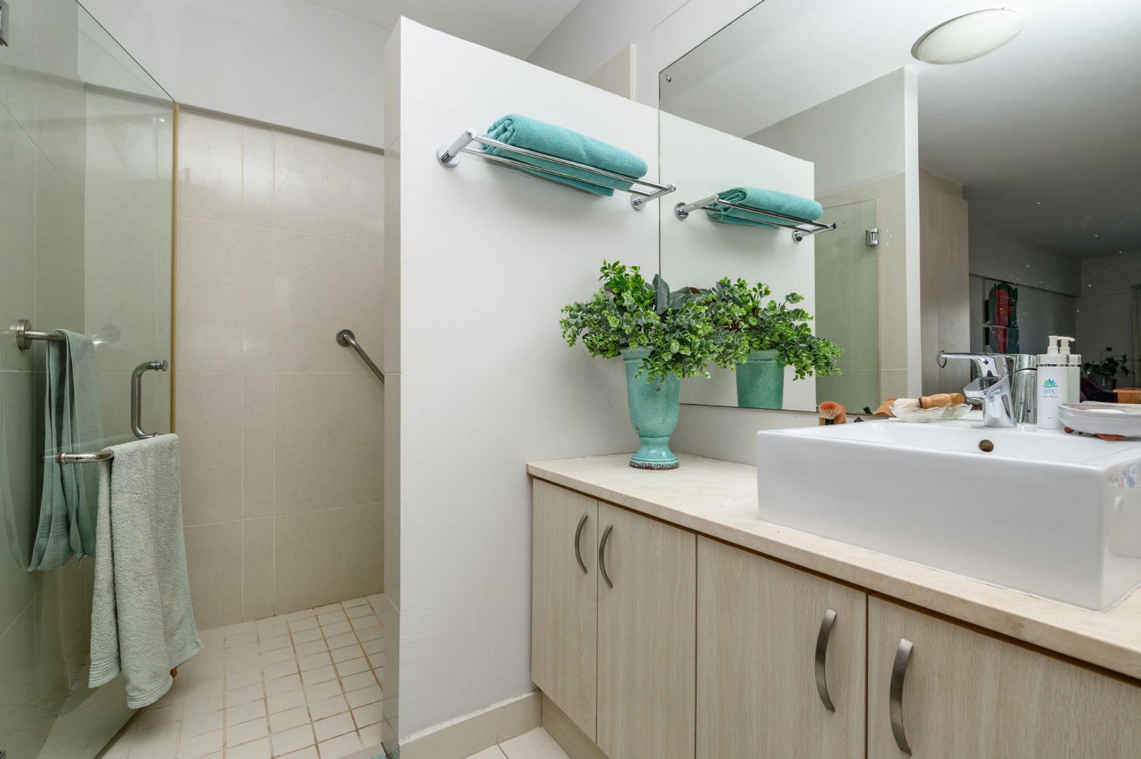 The spacious master bedroom boasts plenty of built-in cupboards and overlooks La Roche Drive. The modern master bathroom features a large walk-in shower, toilet with safety handles, and a stylish vanity.