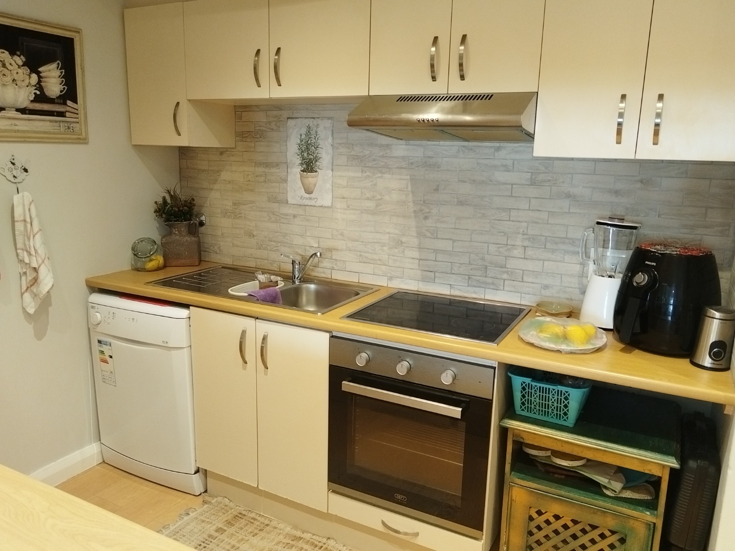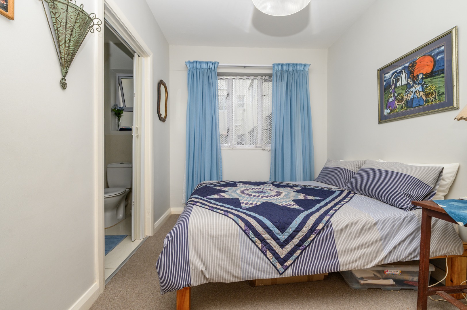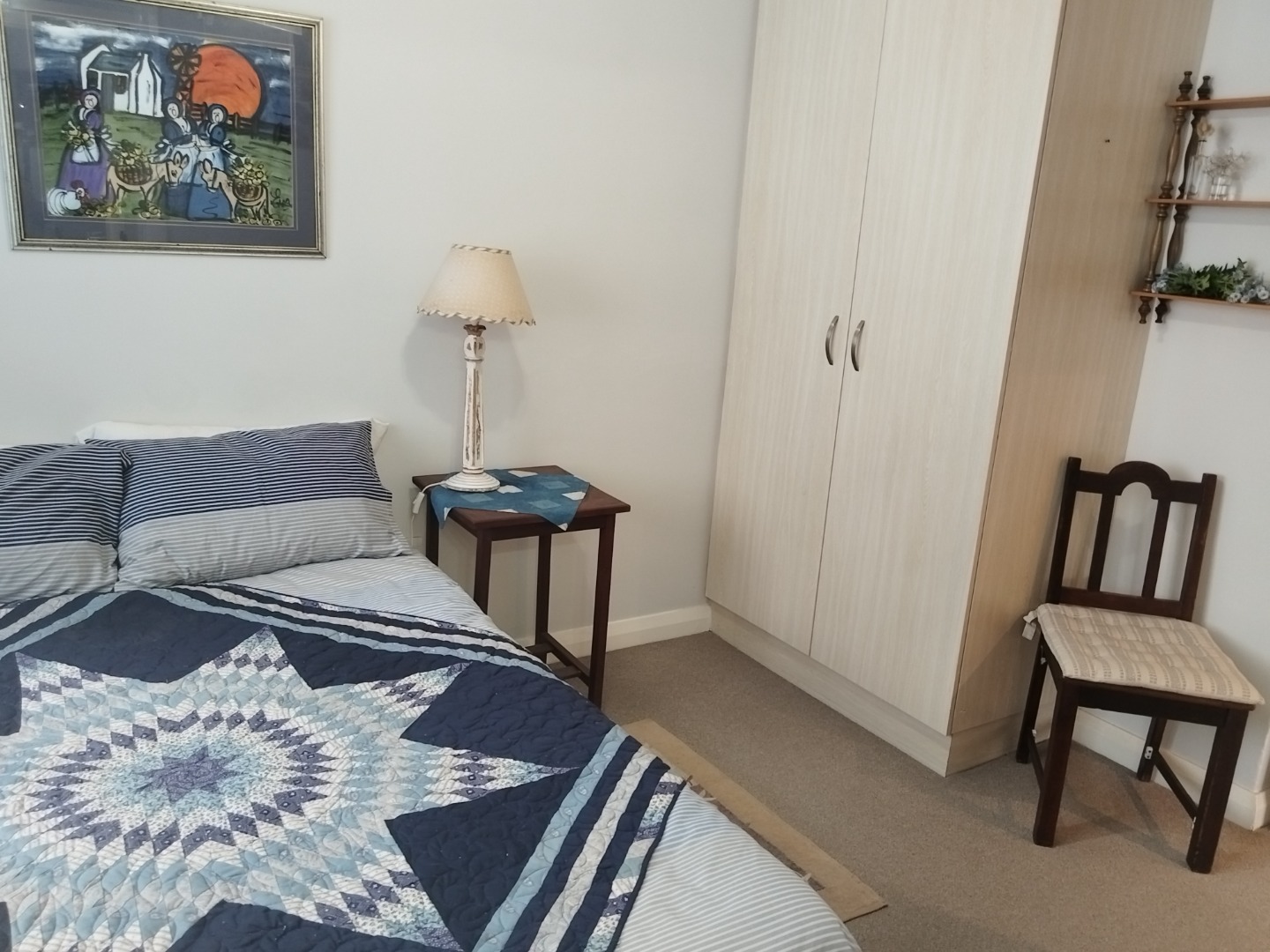 The guest bedroom accommodates a double bed, with an ensuite shower and built-in cupboards.