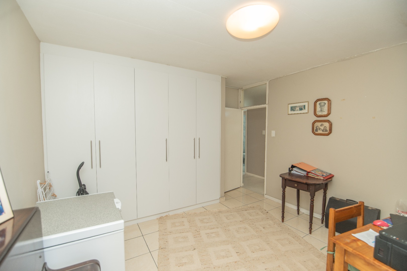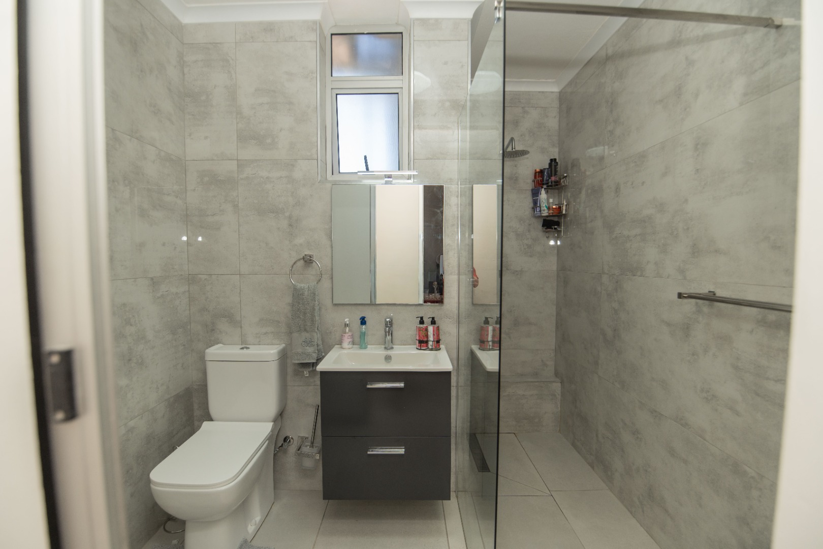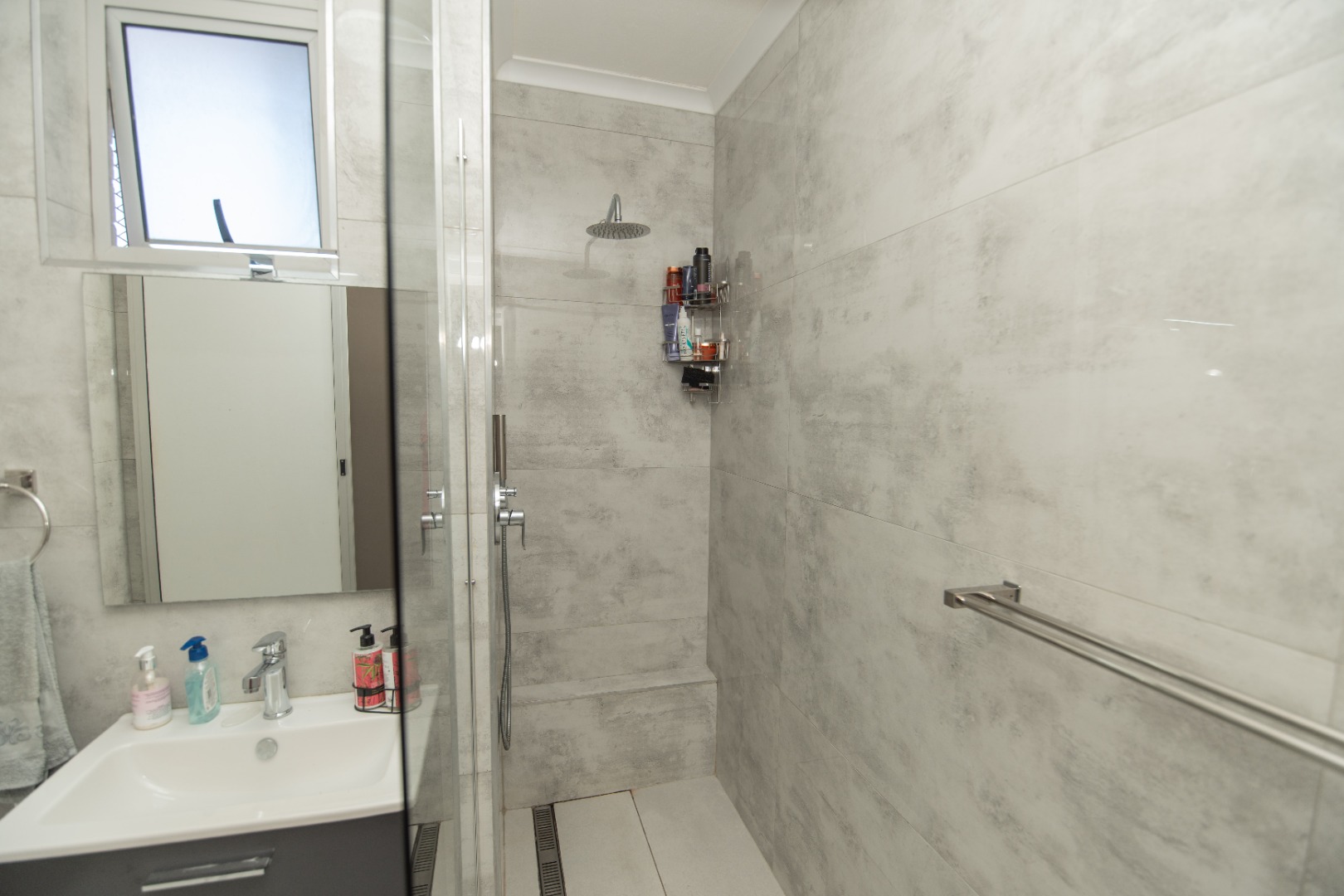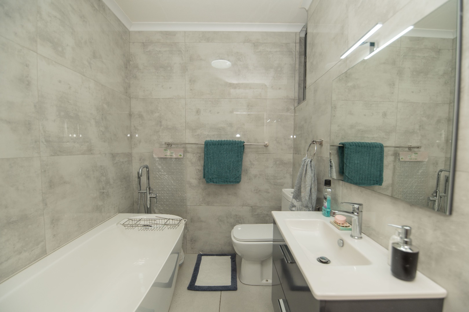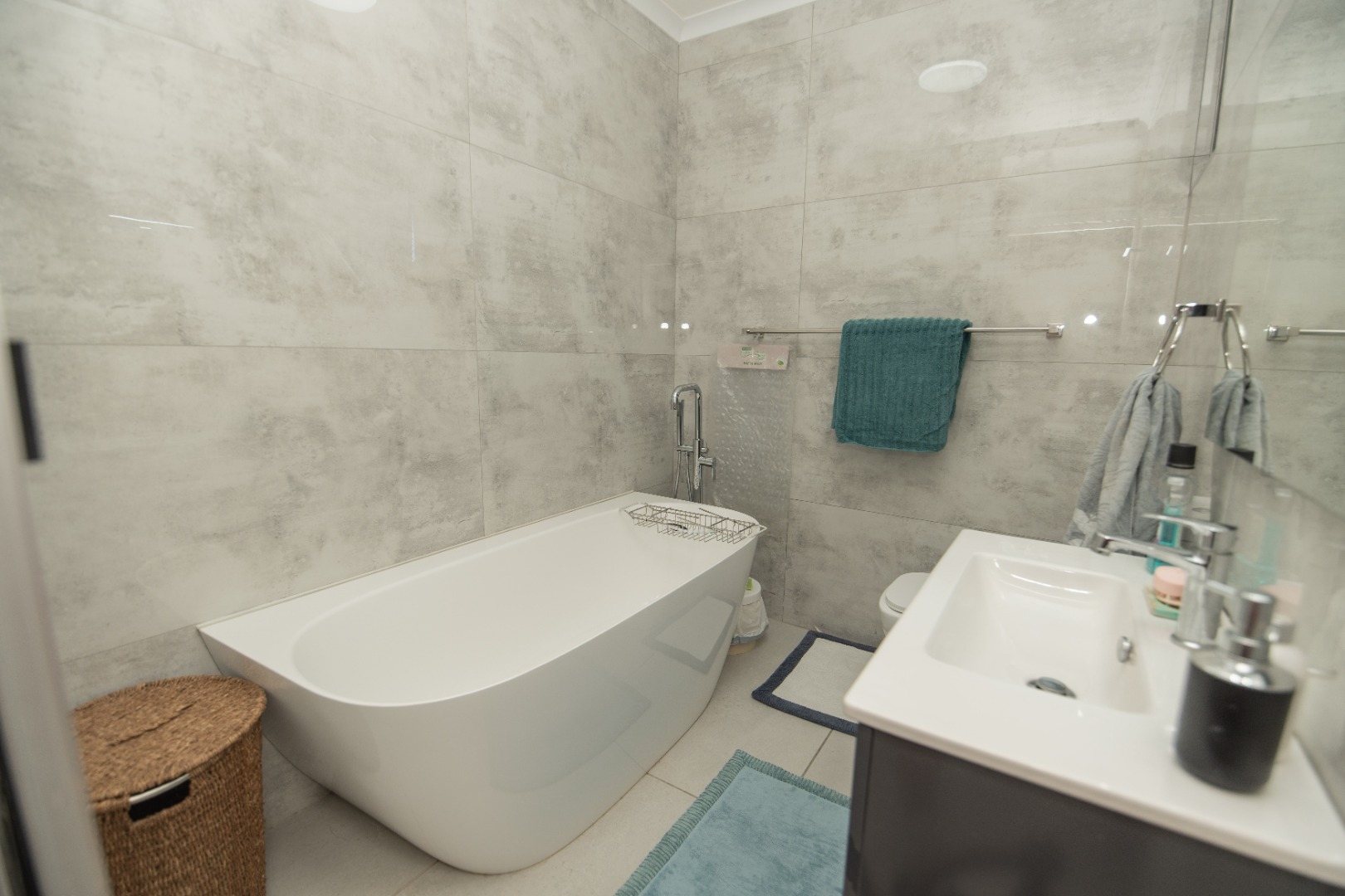The master bedroom is a retreat in itself, with new tasteful quality laminated flooring, ample cupboards, and a built-in dressing table, taking in the stunning sea views.