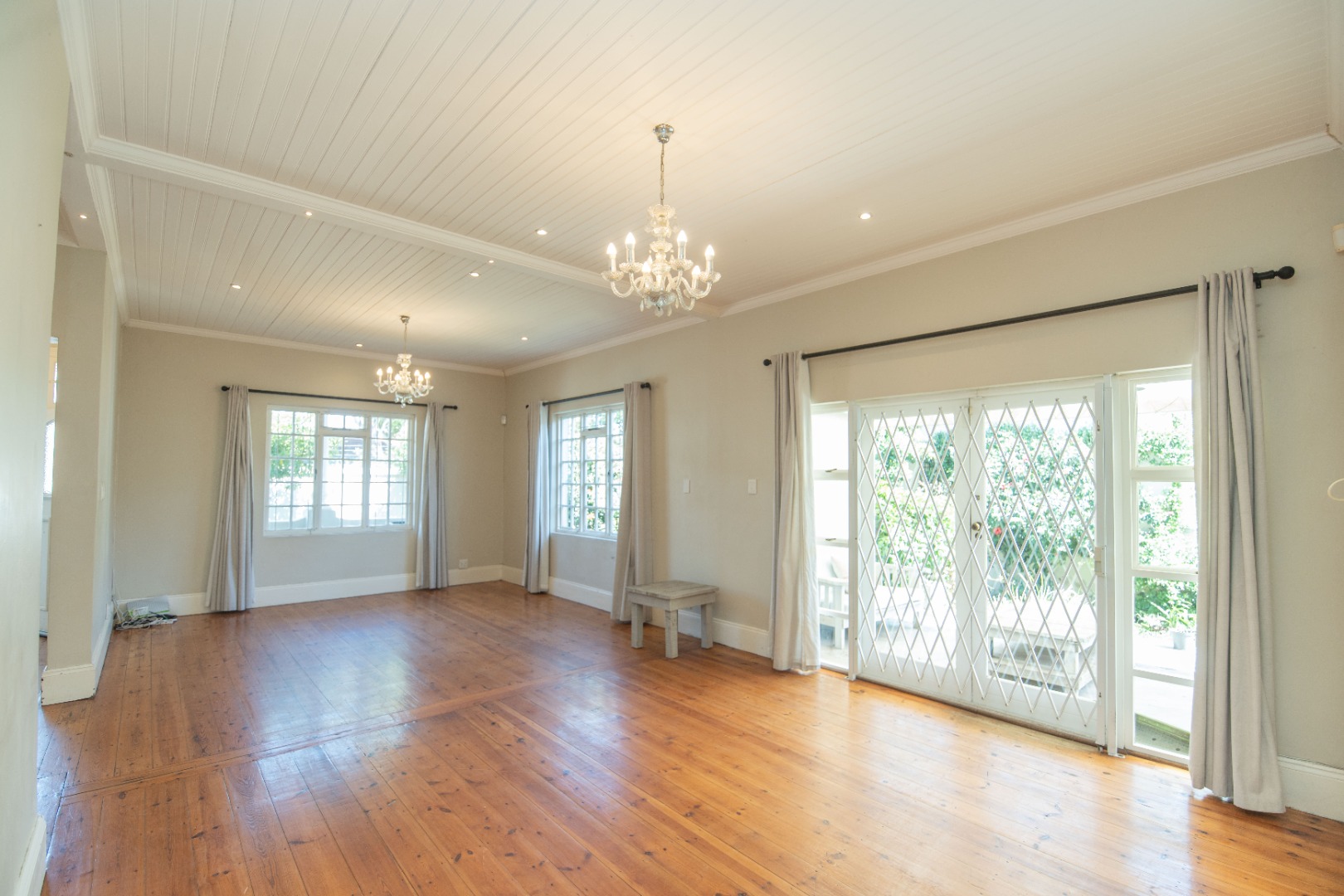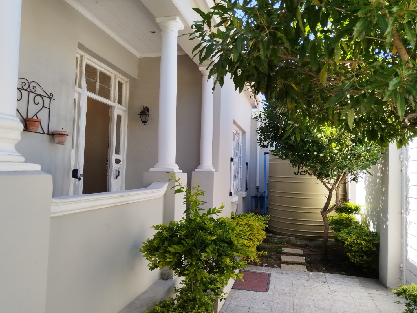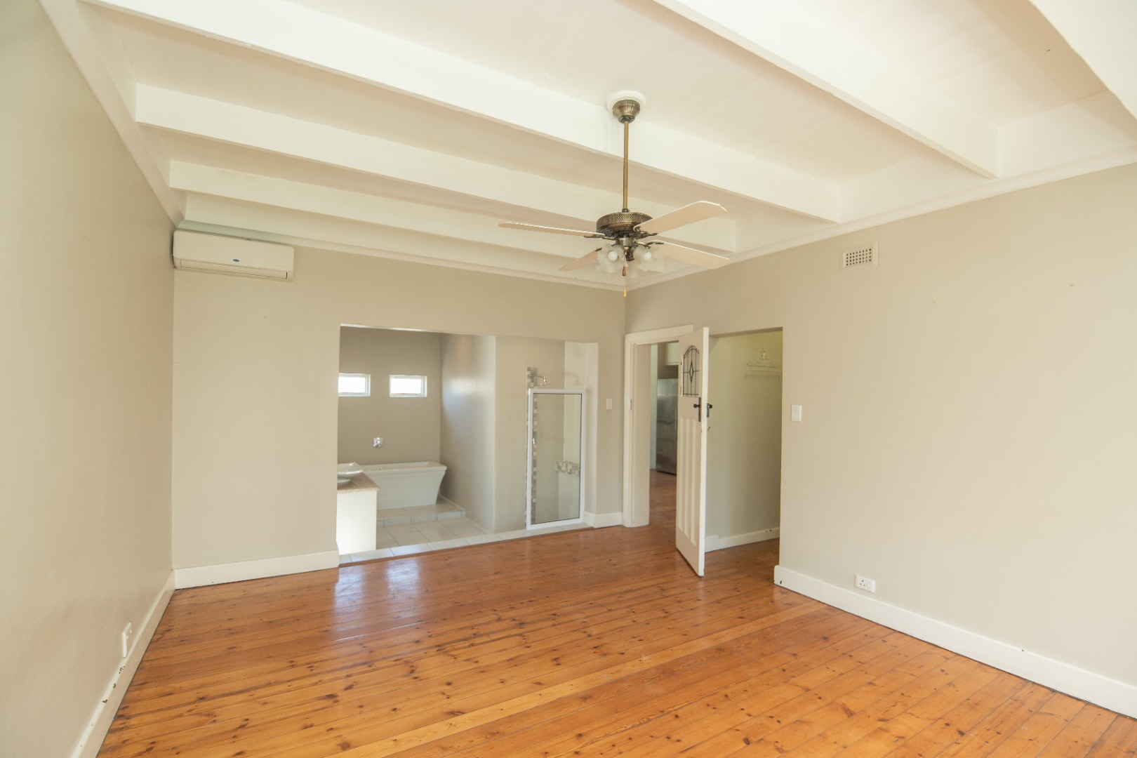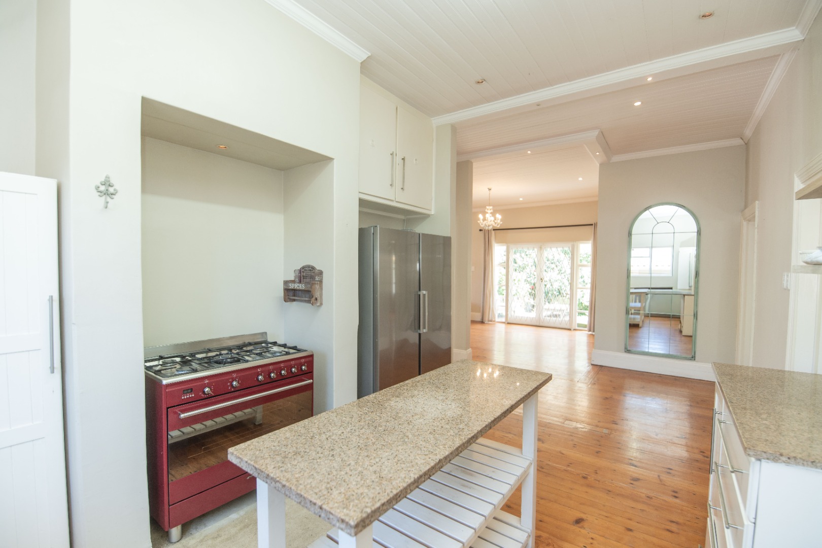 The large open-plan living area boasts high ceilings, two chandeliers, and French doors leading to the covered patio. Open plan to the kitchen, which features granite tops and a beautiful red Smeg gas stove. A guest toilet is off the kitchen, and the master bedroom is at the end of the living area. This large bedroom opens onto the covered patio via double doors and has a newly renovated bathroom with a stunning bath, vanity, shower, and toilet.