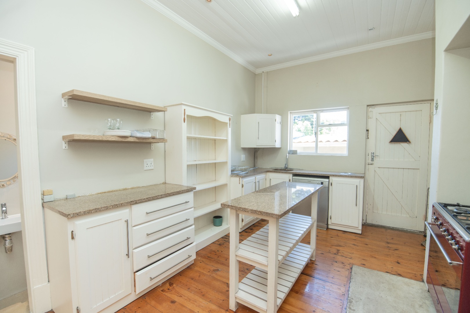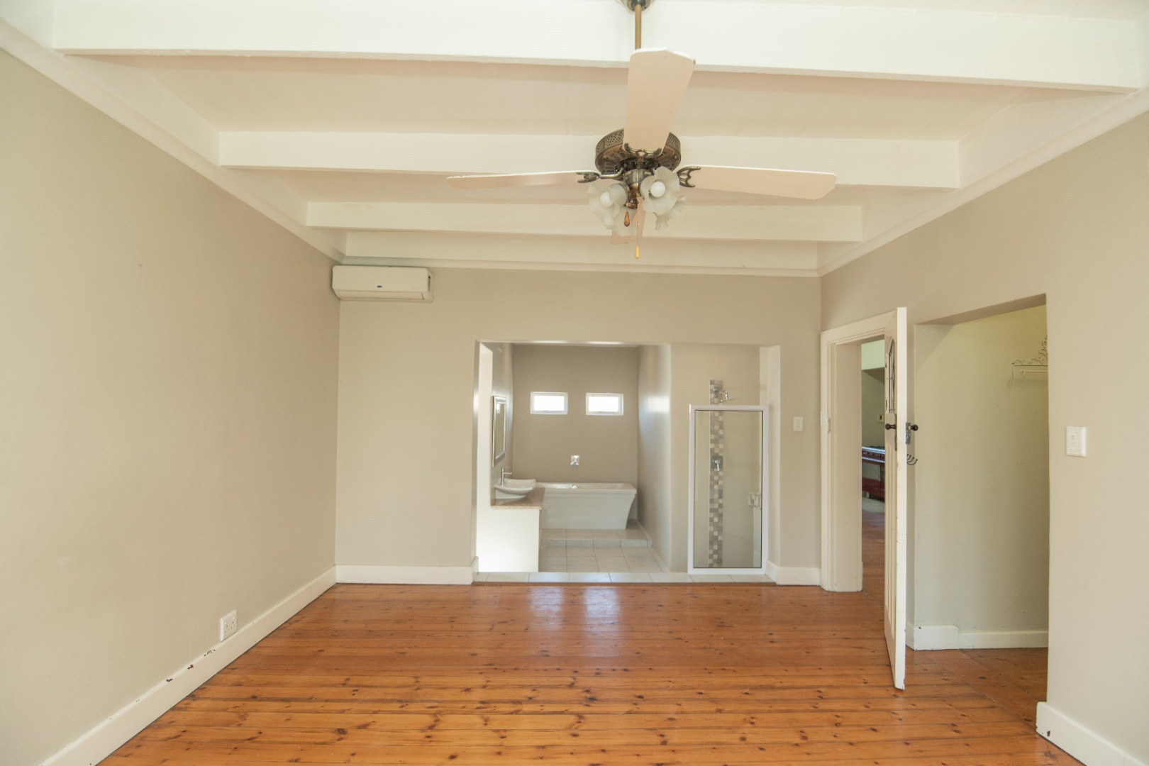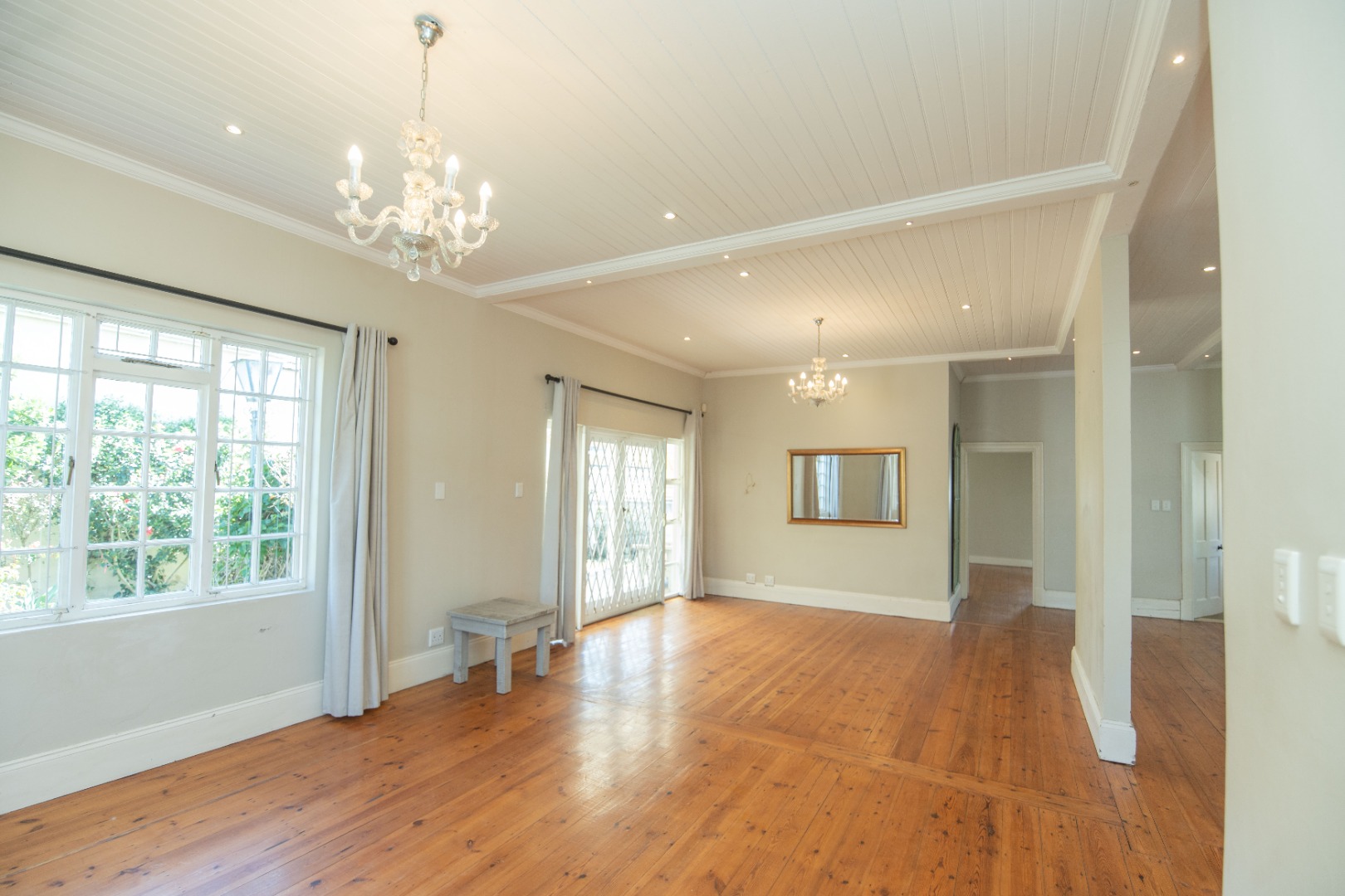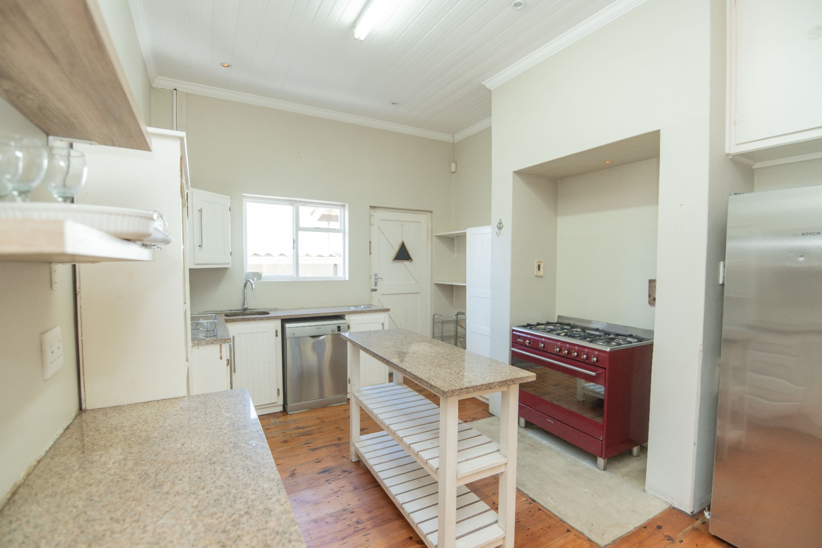 The large open-plan living area boasts high ceilings, two chandeliers, and French doors leading to the covered patio. Open plan to the kitchen, which features granite tops and a beautiful red Smeg gas stove. A guest toilet is off the kitchen, and the master bedroom is at the end of the living area. This large bedroom opens onto the covered patio via double doors and has a newly renovated bathroom with a stunning bath, vanity, shower, and toilet.