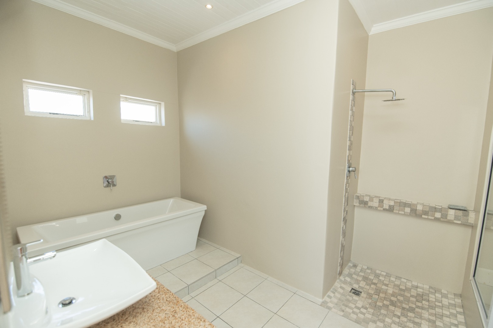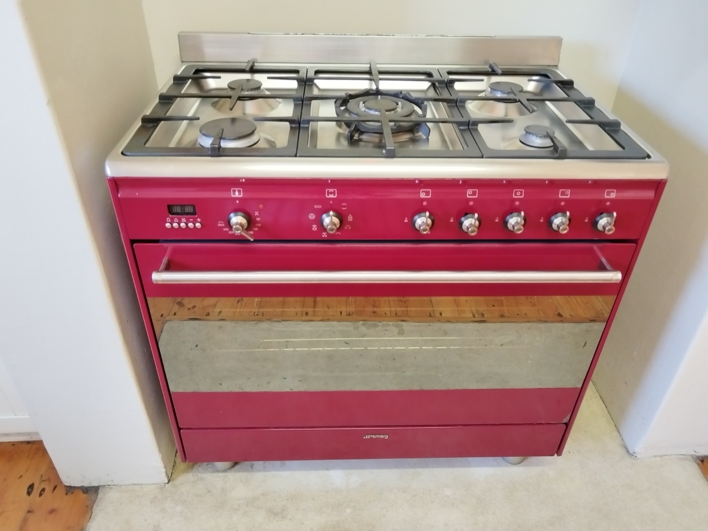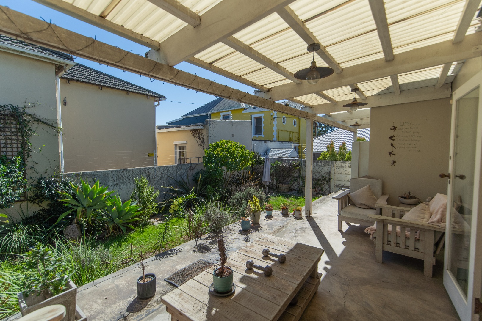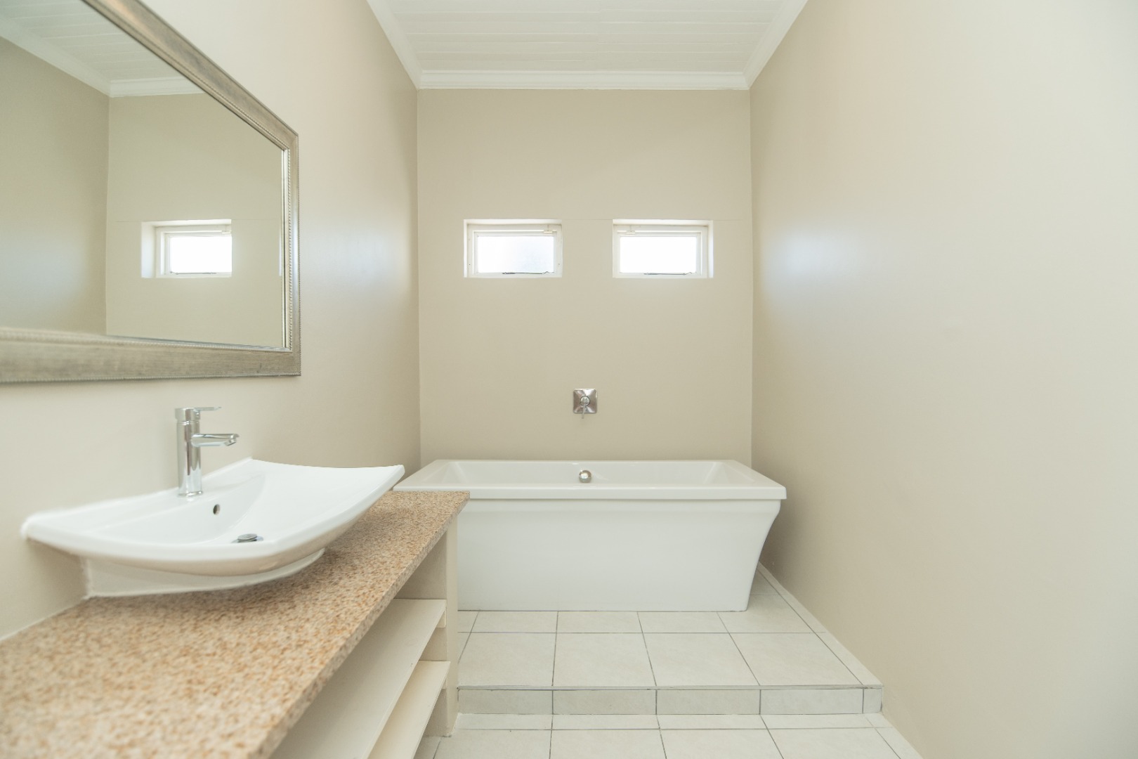 The large open-plan living area boasts high ceilings, two chandeliers, and French doors leading to the covered patio. Open plan to the kitchen, which features granite tops and a beautiful red Smeg gas stove. A guest toilet is off the kitchen, and the master bedroom is at the end of the living area. This large bedroom opens onto the covered patio via double doors and has a newly renovated bathroom with a stunning bath, vanity, shower, and toilet.