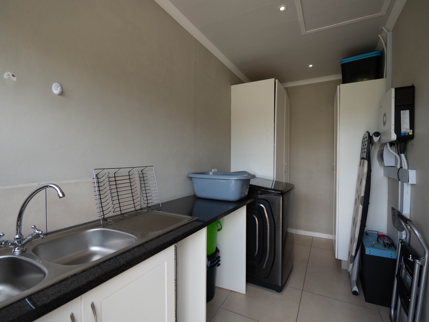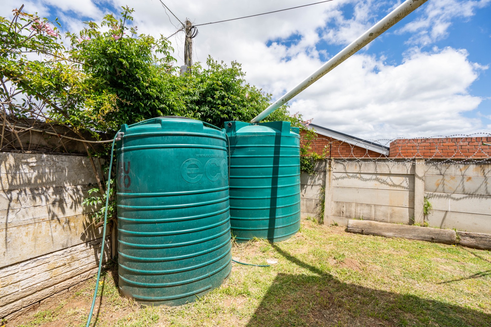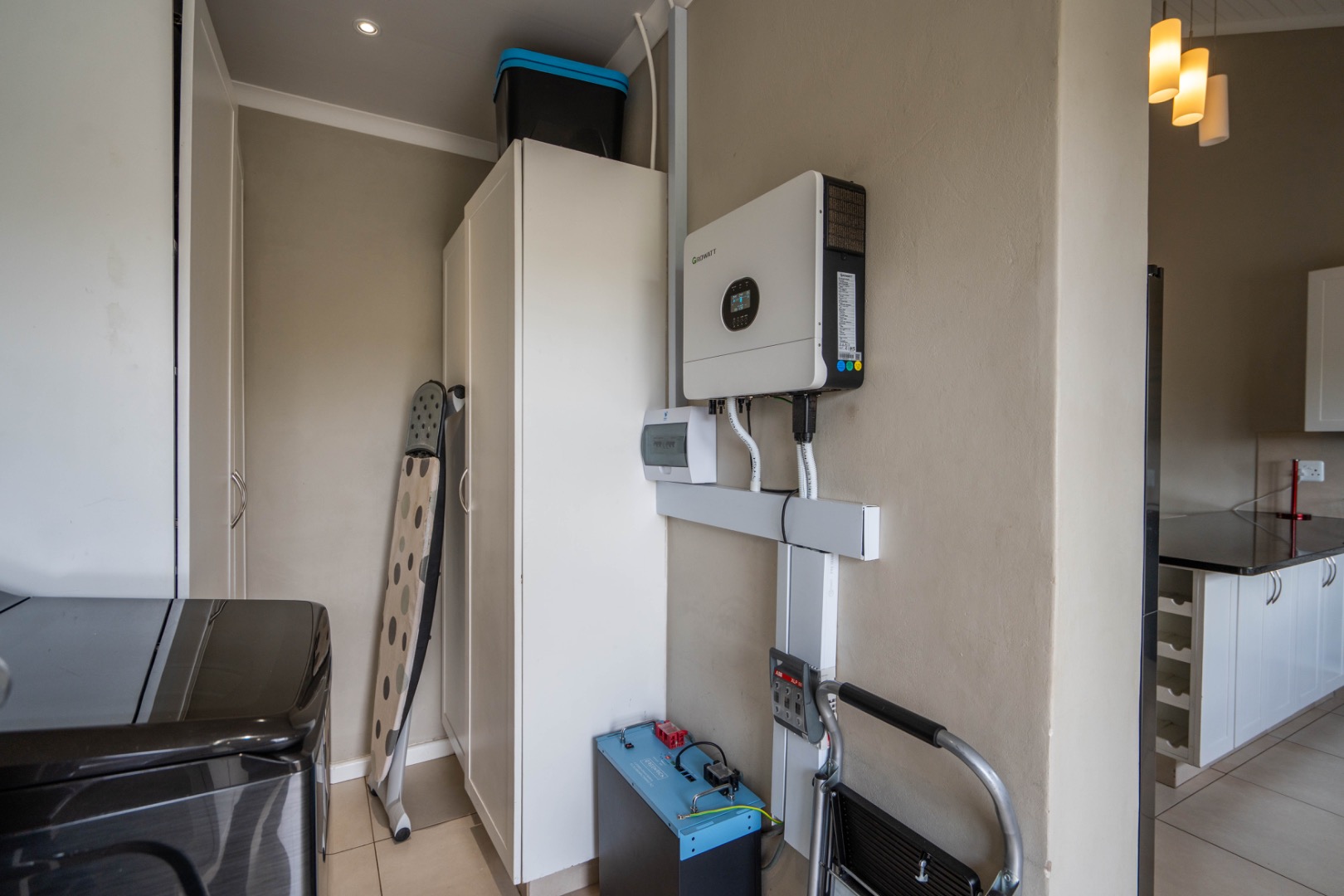 Outside, the 478 sqm erf provides a private garden and paved areas, ideal for outdoor relaxation. With four dedicated open parking spaces, there is plenty of room for vehicles. The property is pet-friendly and secured with an alarm system, access gate, and a totally walled perimeter. Practical features include water tanks and a battery inverter, enhancing sustainability and peace of mind.