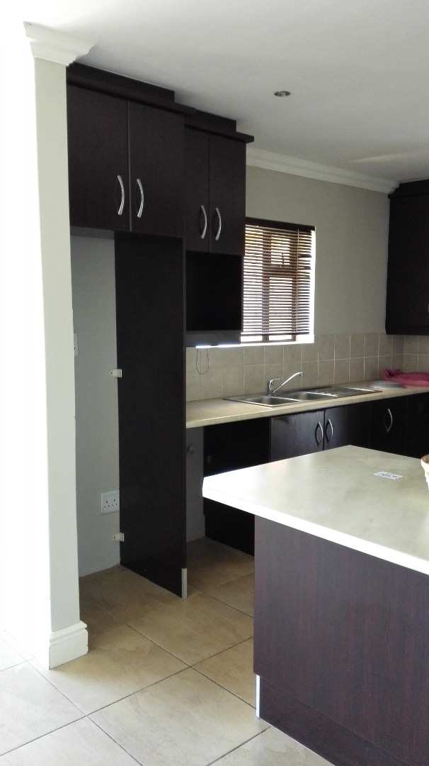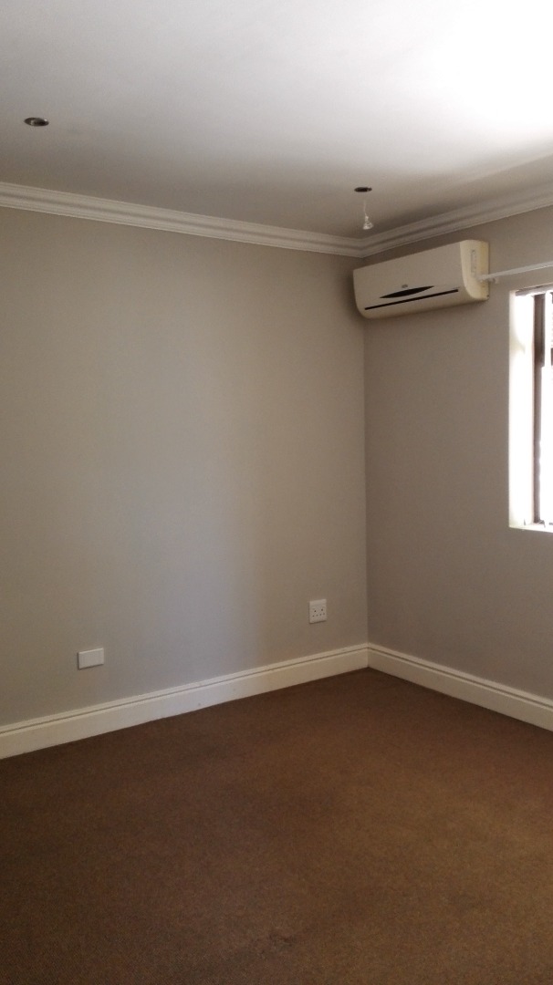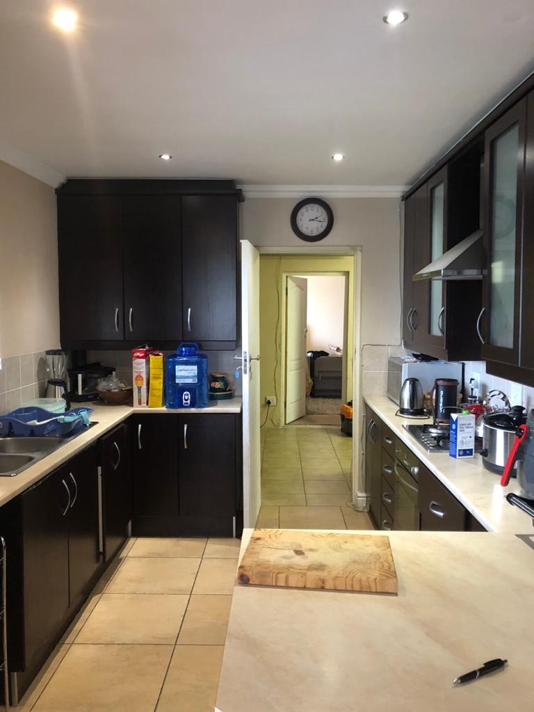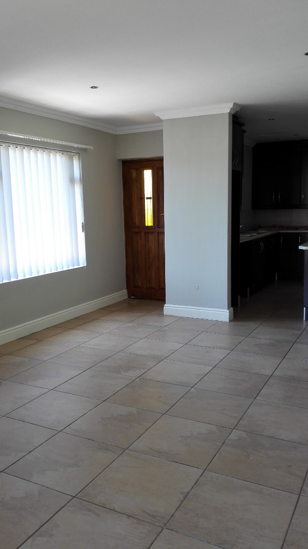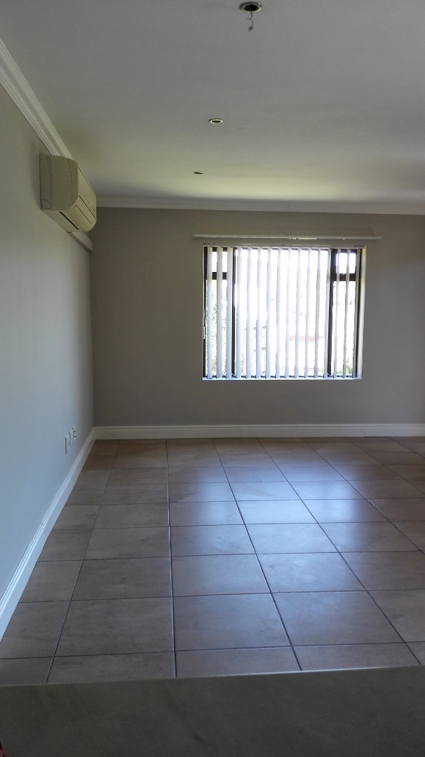 This inviting 3-bedroom, 2-bathroom residence in Mount Pleasant, Port Elizabeth, offers comfortable living with modern finishes. The interior boasts an open-plan living space. Recessed lighting enhances the bright atmosphere, complemented by natural light from large windows. The functional kitchen is equipped with extensive dark wood cabinetry, generous light countertops, a tiled backsplash, and a convenient island/peninsula, providing ample storage and preparation space. An air conditioning unit ensures climate control for year-round comfort.