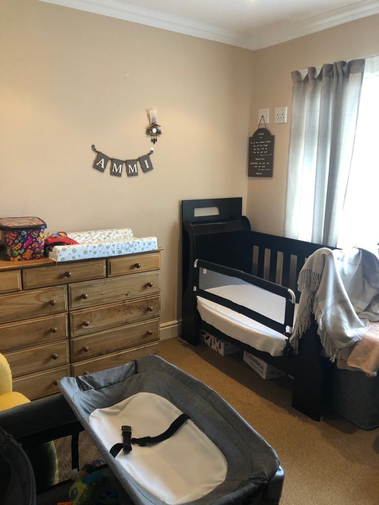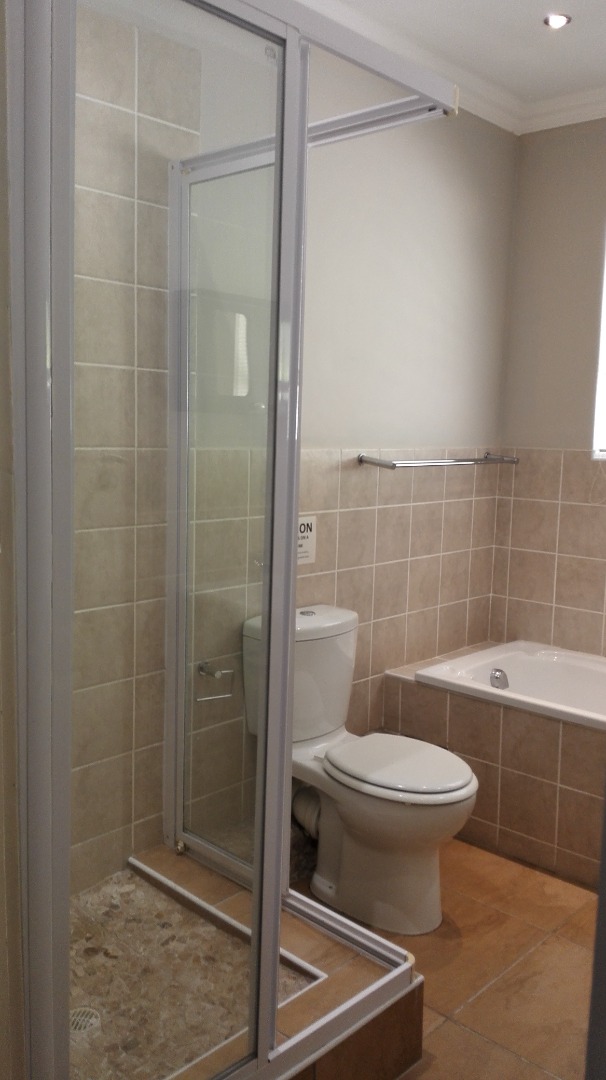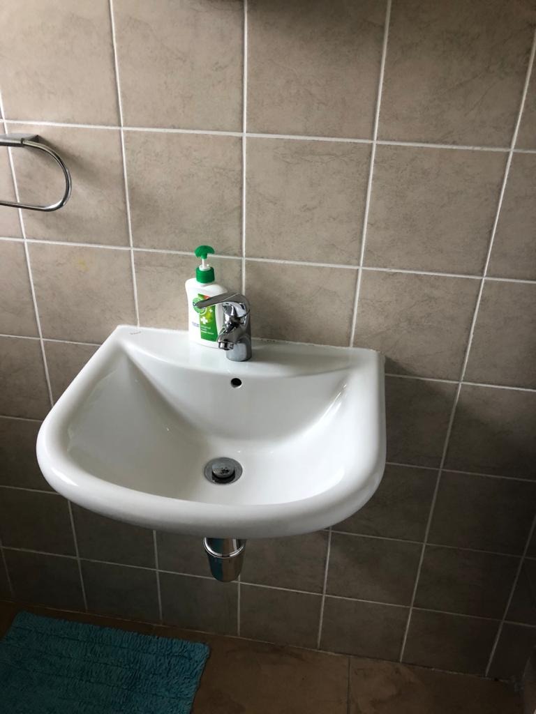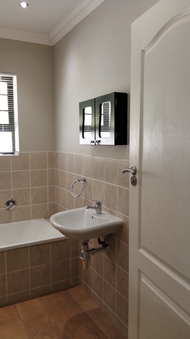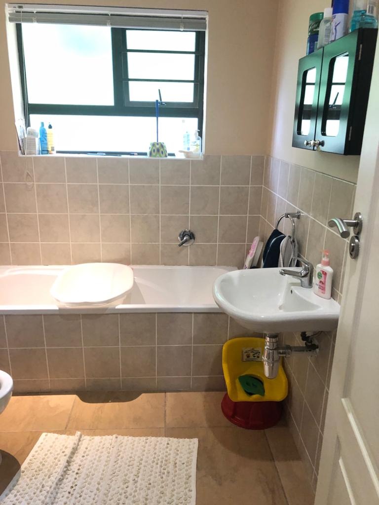 The three well-proportioned bedrooms offer neutral decor and natural light, creating versatile spaces for relaxation or a home office. The two bathrooms are fully tiled, with one including a bathtub and a wall-mounted sink, designed for practicality and easy maintenance.
