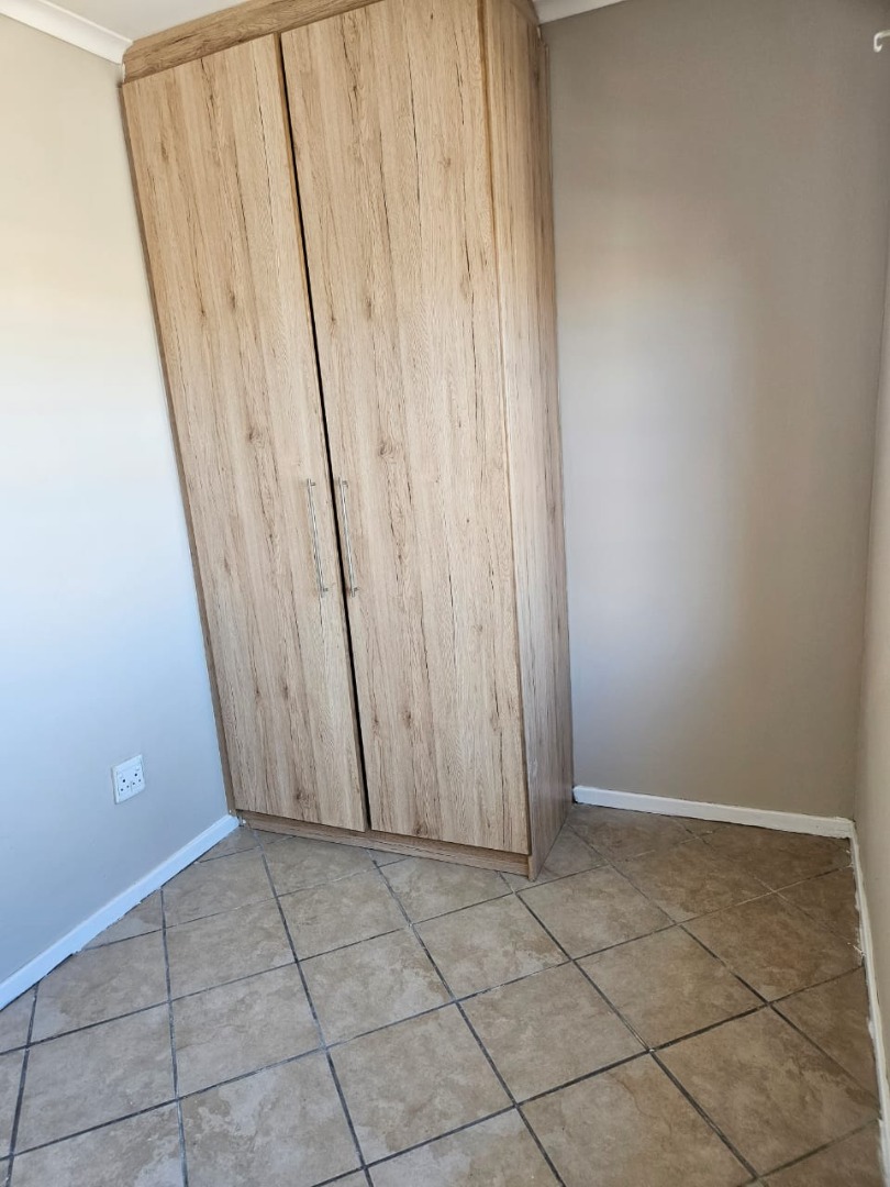 The functional kitchen is equipped with wooden cabinets, countertops, an integrated oven, and a hob, complemented by a convenient breakfast bar for casual dining or additional workspace. Tiled flooring extends throughout the entire property, ensuring easy maintenance and a clean aesthetic. Both bedrooms are fitted with built-in wardrobes, providing essential storage solutions and contributing to an uncluttered living environment.